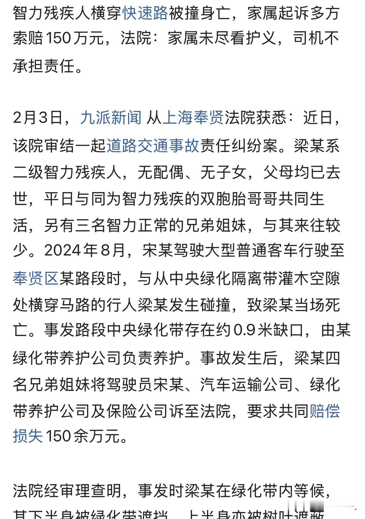 “如意算盘打的太响!”上海,男子是二级智力残疾人,有4个兄弟姐妹,父母早逝,未娶妻,无子女。与同样智力残疾的双胞胎哥哥生活在一起,其他3个正常兄弟姐妹很少与其来往。一日,男子横穿马路,被一快速经过的客车撞死。事后,3个兄弟姐妹蹦了出来,把司机、运输公司、绿化带养护公司和保险公司一并告上法庭,狮子大开口索赔150多万。法院的判决大快人心。 近日,上海奉贤法院审理了一起道路交通事故责任纠纷案, 人这辈子,从出生就注定了命运不同,哪有什么公平可言?有的人一出生就在富贵人家,含着金汤匙长大,集父母的宠爱于一身;有的人却从出生起,就不得不直面生活的清贫与艰难。 更有甚者,一出生连个健康的身体都没有,梁某就是这样一个被命运捉弄的人。 他一出生就智力残疾,和他一样情况的还有其双胞胎哥哥,小的时候有父母照顾,生活的还算可以。 后来父母都相继去世了,他只能和双胞胎哥哥相依为命,苟且生活。 其实,他还有3个智力正常的哥哥,只是他们三人,早把他们这对双胞胎兄弟抛诸脑后,从不与他们来往,生怕拖了他们后腿,各自过幸福生活去了。 然而,命运还是不能放过这个可怜人。 2024年8月的一天下午,梁某独自溜达出去,稀里糊涂的钻进了绿化带里。 他突然从中央绿化隔离带的灌木丛缺口里窜了出来。 司机宋某开着大型客车正好在这条路段正常行驶。 梁某就这么突然出现,他根本来不及反应,客车躲闪不及,直接撞了上去,导致梁某当场就没了。 梁某发生意外后,其他3个智力正常的兄弟姐妹蹦了了出来。 他们发现事发的绿化带确实有个约0.9米宽的缺口,是某养护公司负责打理的。 3兄弟姐妹认为,这缺口就是祸根,养护公司没管好,司机也有责任,所以把相关四方都告上了法庭,要求赔偿150多万损失。 但法院审理后,发现事发当日监控完整的记录了整个过程。 事发时梁某躲在绿化带里,下半身被灌木挡着,上半身也被树叶遮得严严实实,司机根本没法提前发现和避免。 关键点:梁某15点05分34秒突然窜出来,才2秒钟就跟客车撞上了,绿化带边缘到撞击点也就2米左右,司机根本来不及反应。 而且宋某发现有人窜出后,4秒内就采取了刹车措施,全程没有分心驾驶,也没有任何违法违规行为,完全是合规操作。 因此,宋某不需要承担责任。 至于那个绿化带缺口,法院认为养护公司没尽到养护义务确实有不作为的地方,但绿化带本来就不是用来阻止行人横穿马路的,它没有这个法定功能,养护公司也想不到会有人借着缺口横穿快速路,所以对这起事故没啥过错,不用赔钱。 《民法典》第28条规定:无民事行为能力或者限制民事行为能力的成年人,由下列有监护能力的人按顺序担任监护人:(一)配偶;(二)父母、子女;(三)其他近亲属;(四)其他愿意担任监护人的个人或者组织,但是须经被监护人住所地的居民委员会、村民委员会或者民政部门同意。 梁某作为二级智力残疾人,属于法律意义上的限制民事行为能力人,无法独立判断横穿快速路的巨大危险。在其父母双亡、无配偶子女的情况下,3个智力正常的兄弟姐妹就是法定监护人,依法负有抚养、照护和保护的义务。 但他们长期对梁某放任不管,任由其与同样残疾的哥哥独自生活,甚至让他独自外出接触危险环境,显然没有尽到监护职责,这正是导致事故发生的根本原因。 最后,法院判决保险公司仅在交强险无责险限额内承担赔偿责任,汽车运输公司承担相应律师费,驳回原告其余诉讼请求。 这起案子判得太解气!梁某的遭遇固然令人同情,但他那三个兄弟姐妹的做法实在让人不齿。 平日里对残疾兄弟不管不顾,生怕沾边拖累自己,出了事倒跳出来狮子大开口,想把责任甩给别人讹钱,算盘打得太响。