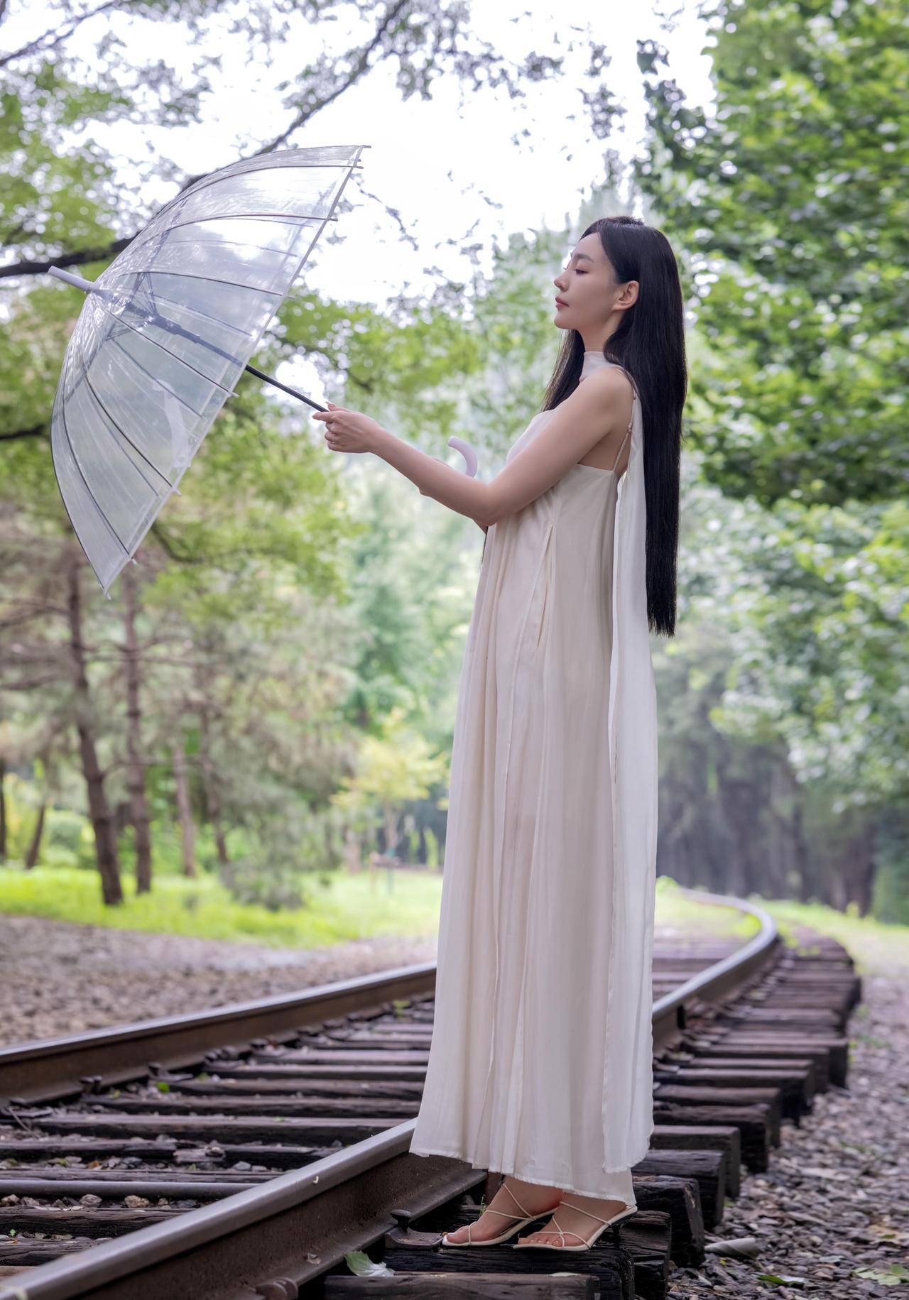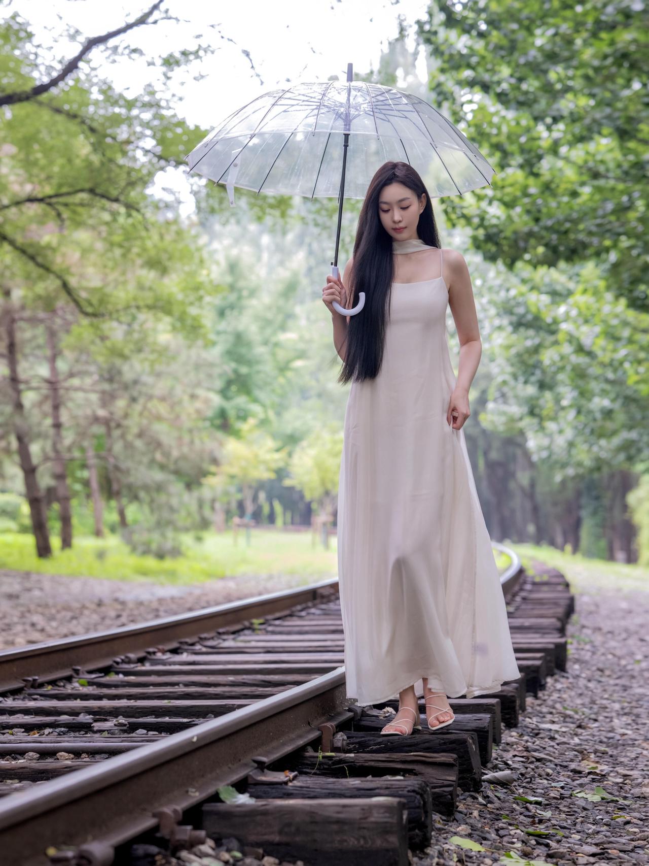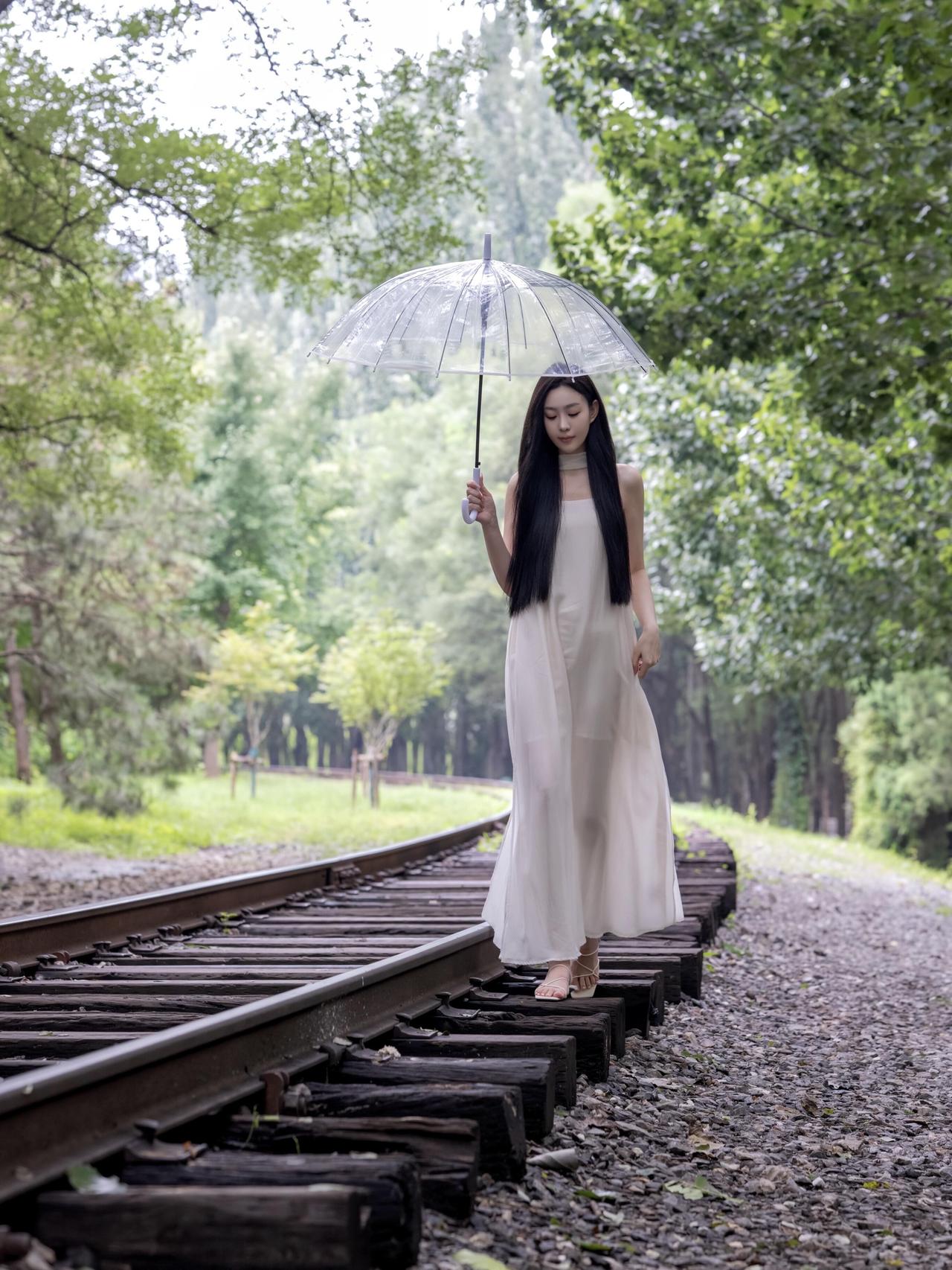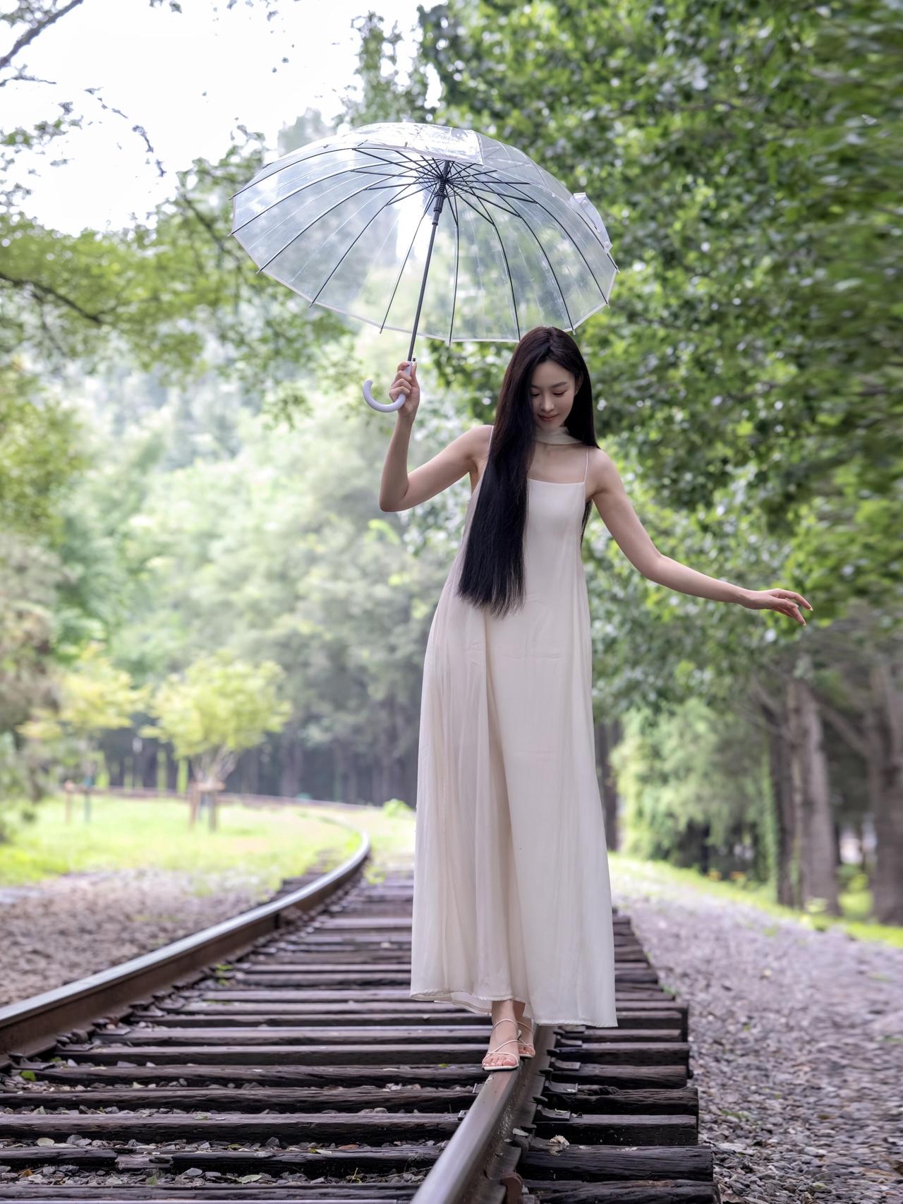 半窗月痕·浣溪沙·林径寻安 旧轨蜿蜒向绿深,轻撑素伞步尘襟,白裙拂过木痕温。 风挽长发摇翠影,心随野色卸烦辛,林间一刻胜千金。 不追车马不寻奔,静坐钢棱听叶韵,淡看云光绕身巡。 世间纷扰皆抛尽,独揽清风伴晨昏,寻常光景最撩人。 一伞遮却半分闷,满目青苍洗心魂,安然自是好乾坤。
