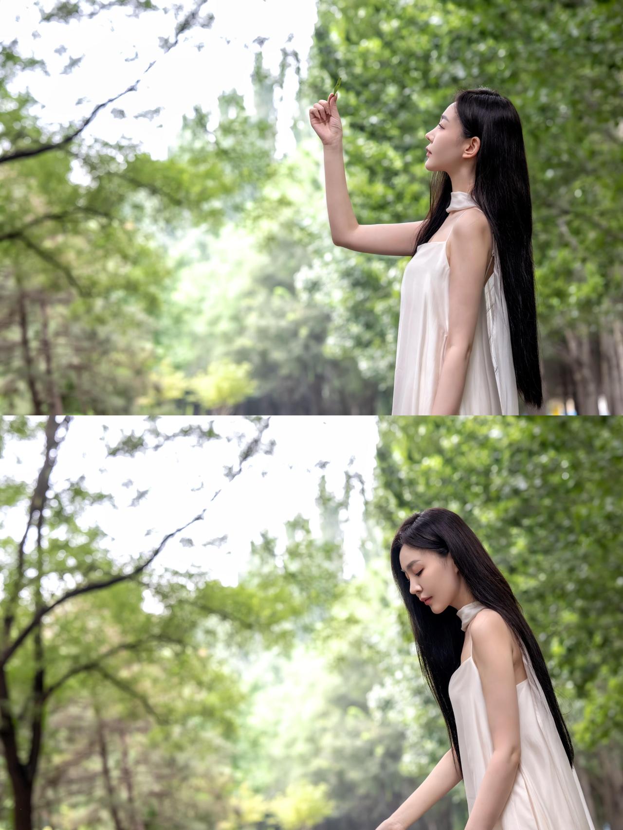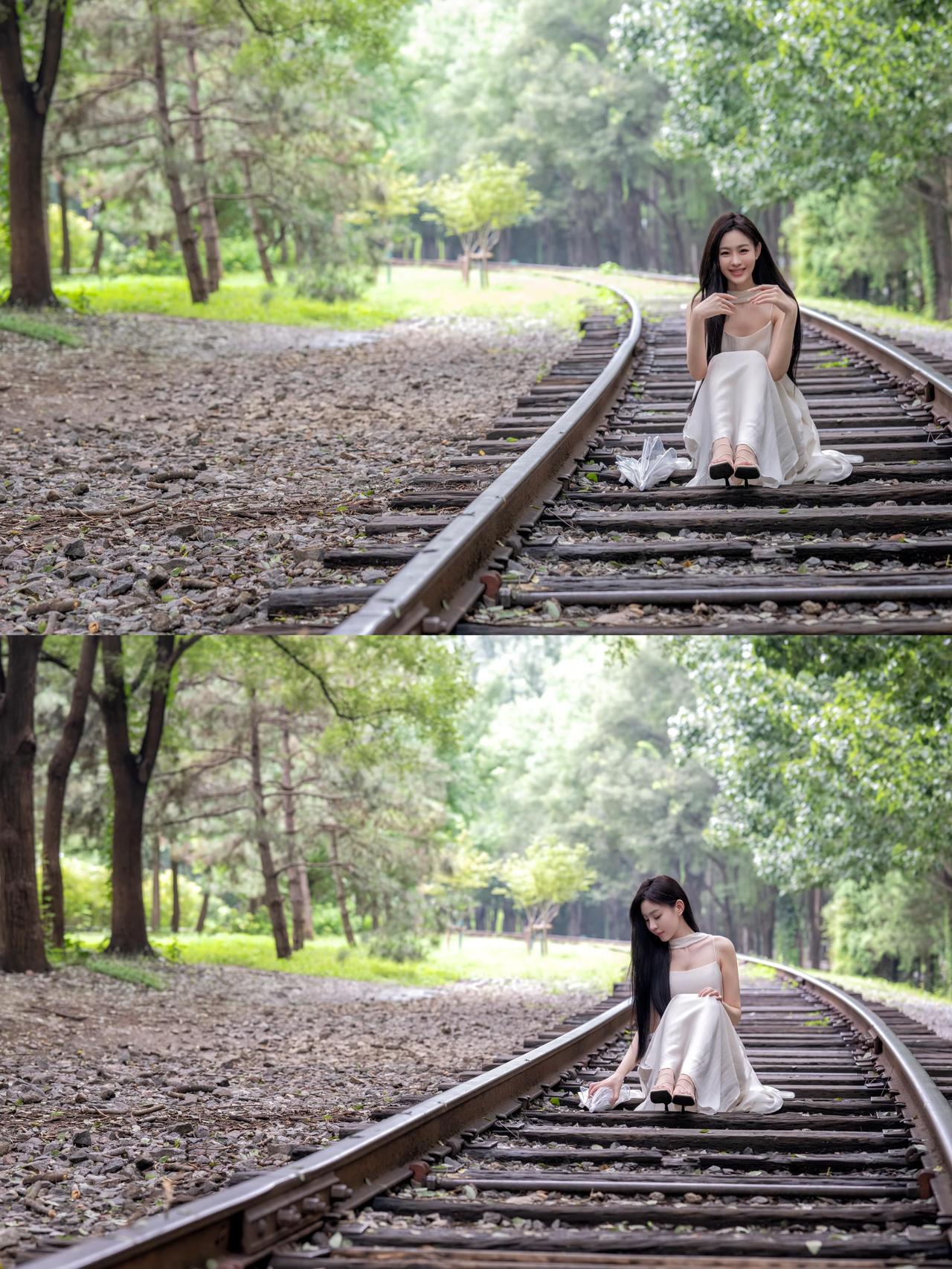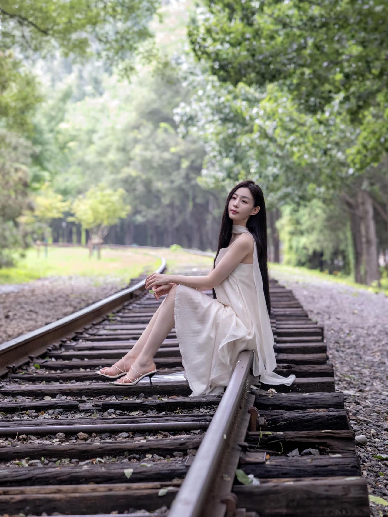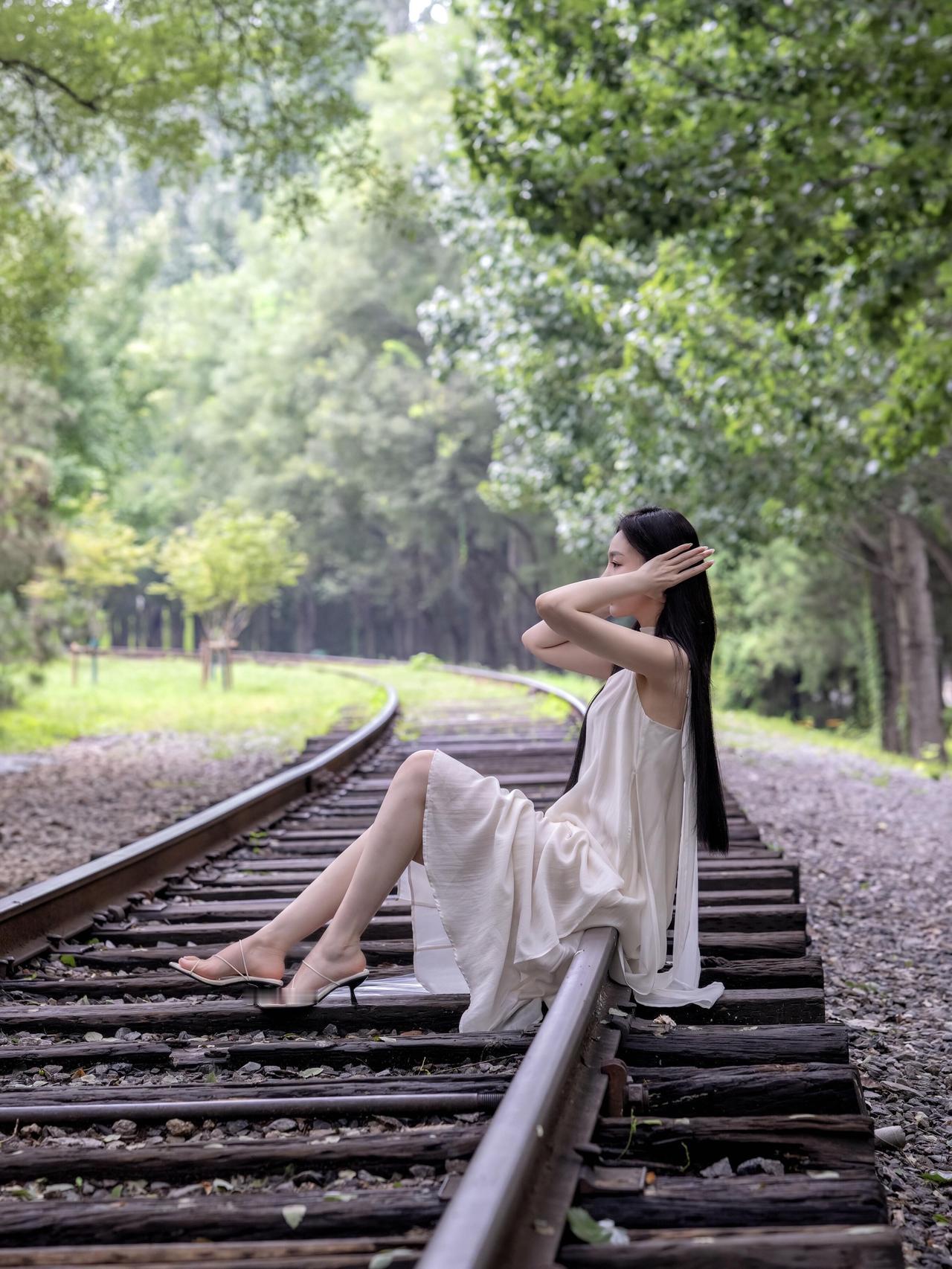半窗月痕·浣溪沙·林径寻安 旧轨蜿蜒向绿深,轻撑素伞步尘襟,白裙拂过木痕温。 风挽长发摇翠影,心随野色卸烦辛,林间一刻胜千金。 不追车马不寻奔,静坐钢棱听叶韵,淡看云光绕身巡。 世间纷扰皆抛尽,独揽清风伴晨昏,寻常光景最撩人。 一伞遮却半分闷,满目青苍洗心魂,安然自是好乾坤。
