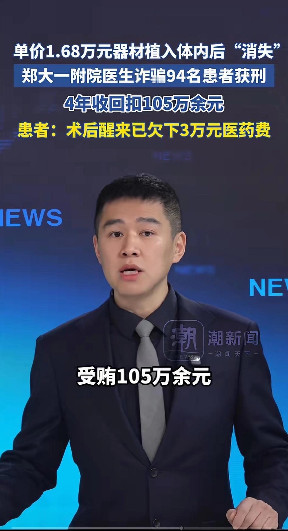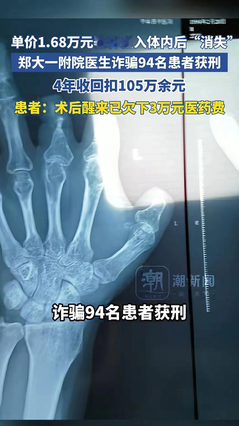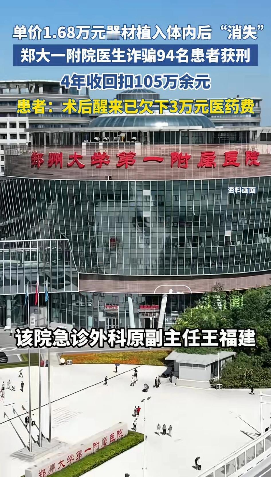 单价1.68万的器材植入体内后“消失”不见了,郑大一附院医生诈骗94名患者获刑。4年收回扣105万。 急诊外科原副主任医师王福建,在2016 - 2020年,对94名手指伤患者下手。 像木工王海森,左手拇指被切断,花3.36万用了2个单价1.68万的微血管吻合装置,结果3年后老家医院X光显示体内根本没这装置。 这医生明目张胆的欺骗患者,就是不知道有没有同谋?自己是怎么完成这所有的步骤,患者术后难道不拍片检查?而且受骗人数高达94名,这可疑之处也太多了。 还有彭先生,4指离断手术花10.08万用6个同款装置,术后X光也不见器械。 这医院也太乱了,各种丑闻频繁爆出,当年的国际郑也是因为一附院的高消费诞生的。 全国的医院医疗事故频出,网络发达了,这些丑事全国人民通过网络都知道了。 也让那些动歪心思的人有些忌惮。 王福建明知这装置不适用于手指手术,还虚假计费,部分器械未用或丢弃。他4年收了105万回扣,最终获刑12年。罚款40万。这哪是治病救人,分明是诈骗敛财,太让患者寒心了!