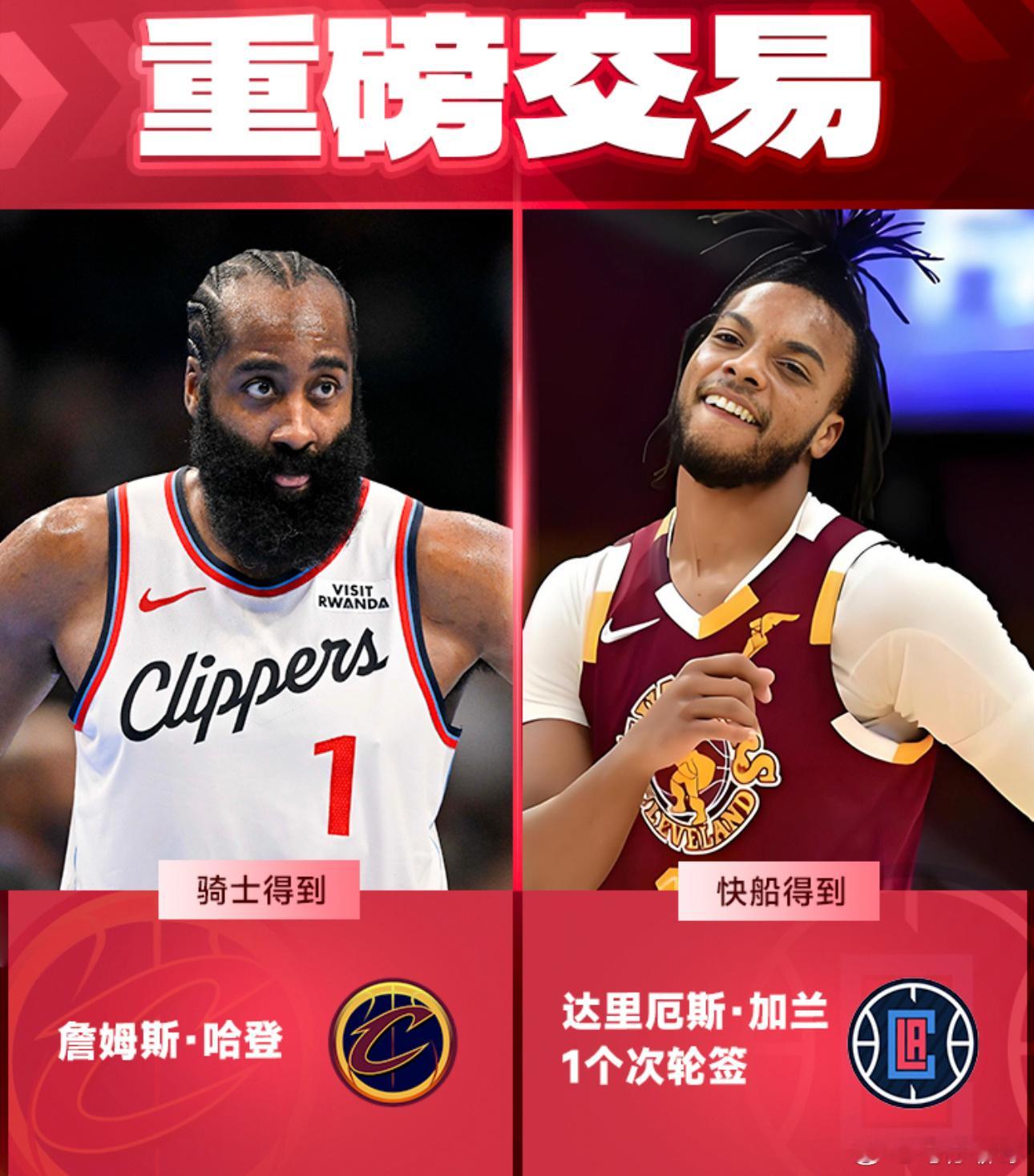 2月4日讯 今日,据ESPN名记Shams报道,快船将后卫哈登交易至骑士,得到加兰以及一个次轮签。