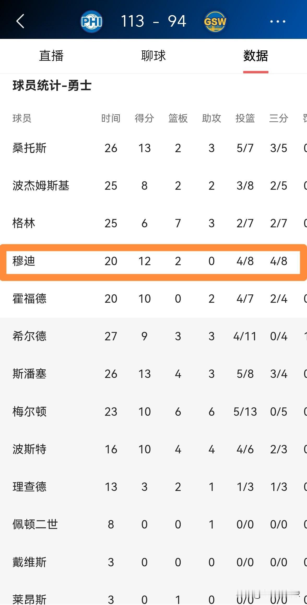 勇士大将穆迪不愧是一名非常出色的3D球员!虽然今天勇士在主场以94:113输给了76人,但是穆迪将自己的3D属性展现的淋漓尽致。 全场比赛下来,穆迪首发出战20分钟,三分球8中4非常高效的砍下12分,还有2篮板1抢断。 老实说,以穆迪在本赛季的表现来看,他已经成为了一名非常出色的3D球员,他在三分球和防守端的出色表现是有目共睹的。