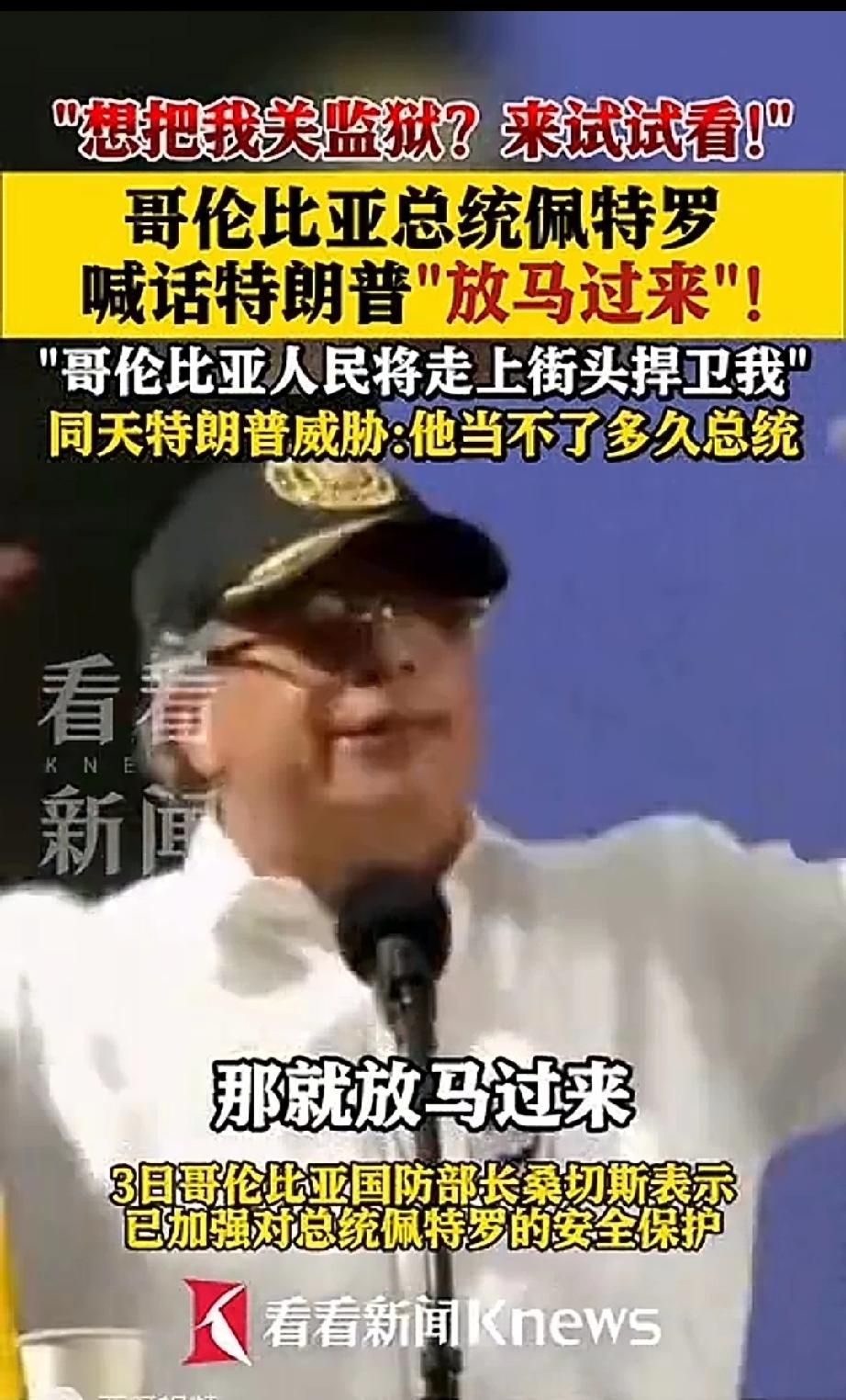 就在一个月前,哥伦比亚总统佩特罗对特朗普放狠话:想抓我,你就放马过来吧。 当地时间2月3号,哥伦比亚总统佩特罗访问美国与特朗普会晤,双方讨论打击毒品走势,特朗普夸赞对方,并声称相处的很好。 嘴上虽然很强硬,但是身体很诚实,主动上门要求示好,然后顺便赔礼道歉,也就是个脸面问题,倒也无妨,最后大家都相安无事。