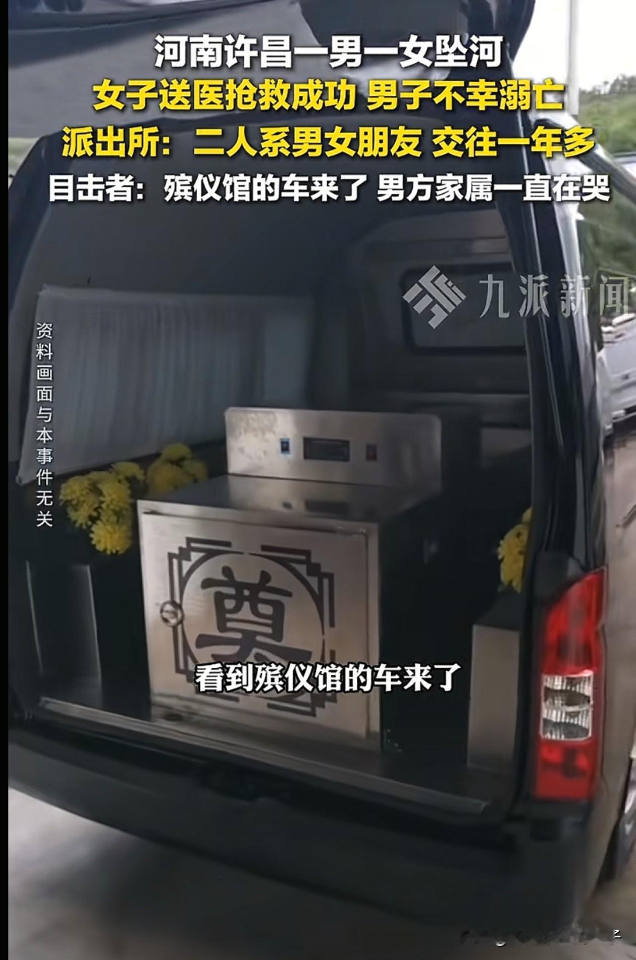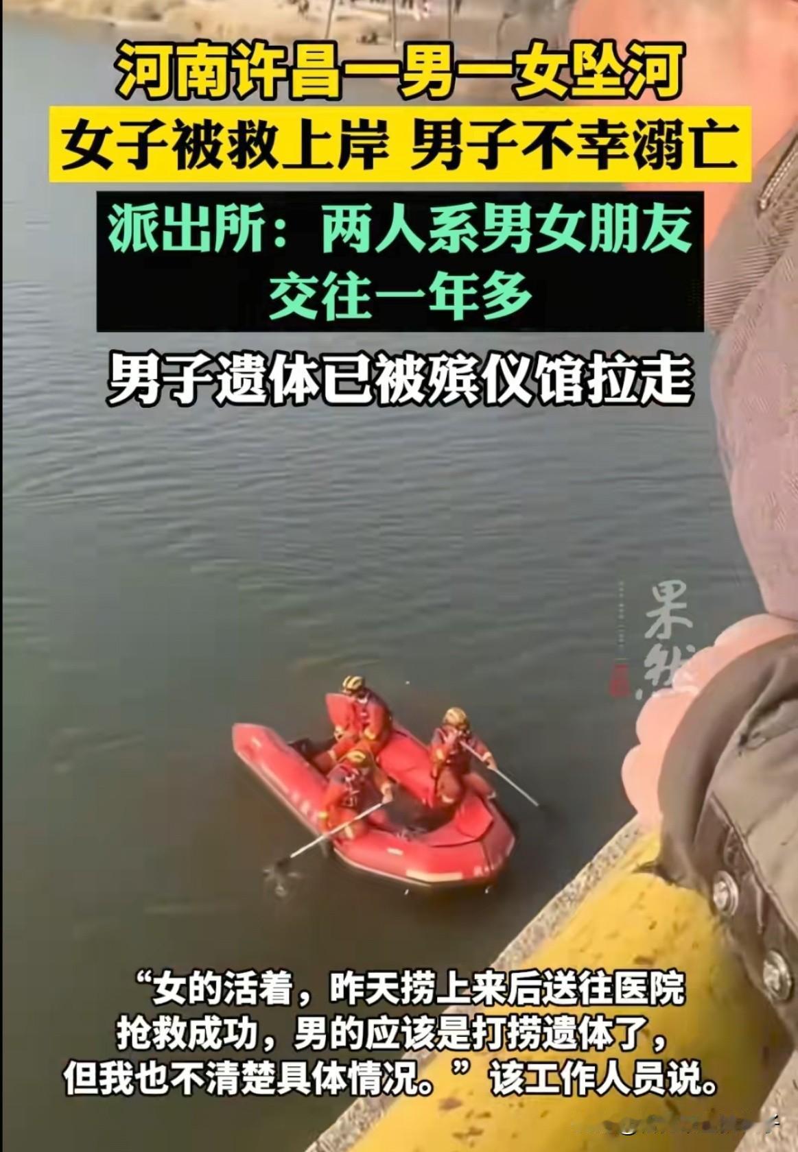 河南许昌发生一起情侣坠河事故,女生获救,男生不幸溺亡,两人为男女朋友! 2月2日晚上8点,河南许昌襄城县北汝河传来呼救声,路上发现有两人在水中呼救,女生当晚被救援上岸,男生直到第2天下午才被打捞上来。 从现场画面可以看到,殡仪馆的车已经停在现场,大桥有很多围观的人,男生的家属也在现场焦急等待。 据现场目击者说,岸边没有挣扎的痕迹,男孩母亲来到现场就瘫软在地,一直哭。 有知情的网友说,俩人似乎是买黄金赔了,男的羽绒服脱了在车上放着,女生因为穿着羽绒服浮起来被救了。 都快过年了,发生这样的事,父母怎么接受得了,好好的孩子就没了!