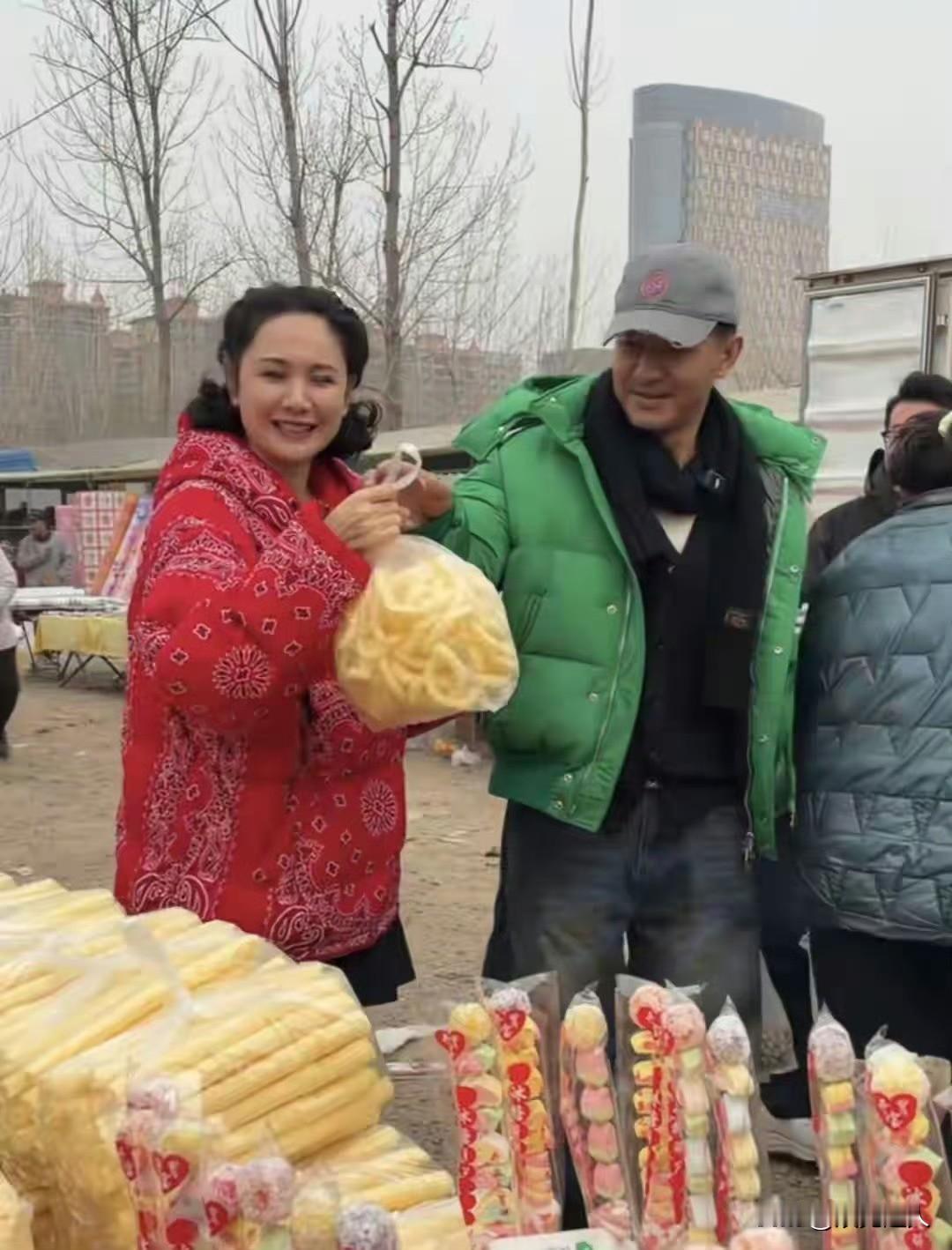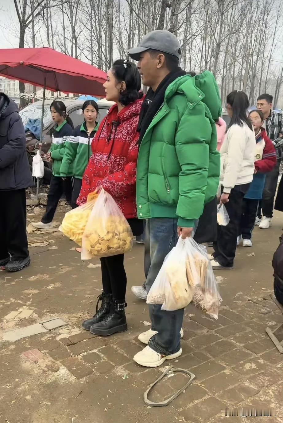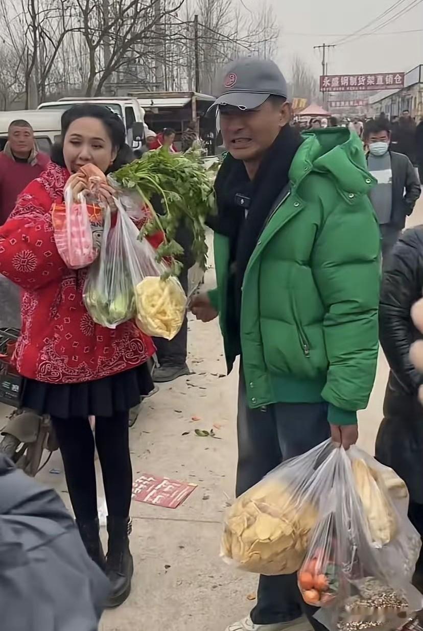 这应该是娱乐圈最接地气明星夫妻! 郭晓东和程莉莎又回村里赶大集啦!被网友偶遇,俩人买了一大堆小吃,程莉莎手里拎着刚买的鸡腿,当场就开啃,郭晓东还嫌她,直接躲到一边去了。 这夫妻俩性格反差,一个是社牛,一个是社恐。有人过来拍照,程莉莎吃得更欢了,反观社恐的郭晓东,反倒羞得不好意思,躲在旁边。程莉莎还站在原地,一个劲喊他过来帮忙擦嘴,画面也太有意思了。 现在俩人经常回村里拍视频,村里人估计都见怪不怪了,还打趣着喊她“赫本回村”,别提多亲切了。
