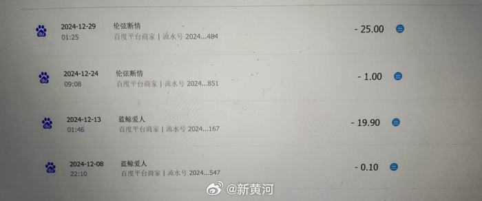 张先生提供的支付记录显示,2024年12月8日,老人在名为“蓝鲸爱人”的百家号博主处支付了0.1元,五天后系统自动扣款19.9元;12月24日,在另一名博主“伦弦断情”处支付1元,五天后又自动续费25元。此后,系统持续自动扣款,累计金额达540元。