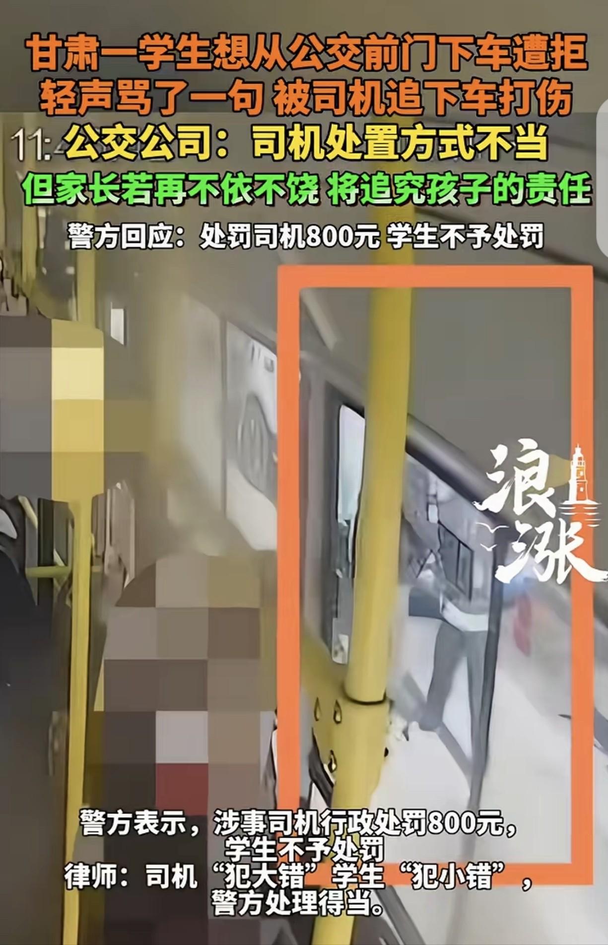 甘肃,一16岁男孩坐公交车,他想从前门下车,司机不让,男孩轻声骂了一句,被司机追下车打了一顿,男孩父亲愤怒报警,说儿子出现“急性应激反应”患上重度焦虑症,构成轻微伤,要求司机赔钱,并支付精神抚慰金。不料,公交公司回应:司机不对,但家长如果再不依不饶,将追究孩子的责任。 一张写着“急性应激反应、重度焦虑症”的医院诊断书,和一张印着“罚款800元”的行政处罚单,此刻正被无形地放在了甘肃一户普通人家的桌面上。 这两张纸太轻,轻到风一吹就能卷走。这两张纸又太重,重到足以压垮一个16岁少年的心理防线,同时也砸碎了我们对公共服务底线的认知。 这不是电影桥段,而是2026年开年发生在甘肃街头的真实一幕。故事的起因微小得简直不值一提:一个性急的少年想违规从公交前门下车,一个恪守规定的司机高声喝止。 如果画面定格在这一秒,这不过是城市早晚高峰里无数次微小摩擦中的一次。但那个名叫晓峰的男孩,在被呵斥后脚步停顿,虽然退了回去,却低声骂了一句。 这一句模糊的抱怨,成了引爆火药桶的最后一颗火星。 你很难想象,一位手握方向盘、本该情绪极其稳定的成年司机,会因为这一句“忤逆”,瞬间完成了从职业驾驶员到街头暴徒的身份切换。 他没有选择职业化的冷处理,而是解开安全带,推开车门,冲了下去。请注意这个动作,当他离开驾驶座的那一刻,性质就变了。这不再是维护乘车秩序,这是一场实打实的私力报复。 身强力壮的成年人追上未成年人,揪衣领、打头、挥拳。男孩在惊恐中甚至结巴得无法辩解,只能被动承受着来自陌生权威的暴力倾泻。直到路人围观指责,司机才松手,留下一句“下次收拾你”的狠话扬长而去。 身体的伤口或许几天就能愈合,但心里的洞却在无限扩大。 晓峰回家后,噩梦、流泪、身体不受控制地发抖,医院给出的结论是残酷的:重度焦虑。对于一个16岁的孩子来说,公交车不再是交通工具,而是一个移动的幽闭恐惧源。 这时候,法律给出了它的裁决。警方依据事实,对未成年的晓峰不予处罚,对动手的司机处以800元罚款。 这个数字在法律程序上或许无懈可击,但在受害者父亲老陈眼里,这简直是种讽刺。800元,买断了儿子的尊严和心理健康? 于是,父亲拿起了《民法典》,要求赔偿医药费和精神抚慰金。这本是受害者家属最本能的反应,却意外撞上了一堵冰冷的墙。 公交公司的回应,堪称教科书级别的“刺猬防御”。 他们承认司机不对,毕竟罚单在那儿摆着。但紧接着的话锋一转,让人背脊发凉:如果家长在赔偿问题上“不依不饶”,公司将启动程序,追究孩子扰乱秩序和辱骂他人的责任。 听听这逻辑,翻译过来就是:我们的人打了你,我们认罚。但如果你想要更多赔偿,我们就动用机构的力量,挖地三尺也要把你的孩子也拖下水。 这种“防御性反击”,把企业的冷酷展现得淋漓尽致。在他们眼里,解决问题的核心不在于抚平受害者的创伤,而在于如何用最低的成本“平事”。 哪怕这个成本,是建立在进一步恐吓一个已经患上重度焦虑症的未成年人之上。 “我的兵我自己管,但你若反击,我就跟你死磕。”这种江湖气的逻辑,竟然堂而皇之地出现在了公共服务机构的回应中。 他们似乎忘了一点,司机手中的方向盘,承载的是公共安全,而不是个人发泄情绪的特权。当800元的罚款无法对等那一纸沉重的诊断书时,社会的公平焦虑就已经在蔓延了。 直到现在,那个看见公交车就发抖的男孩,还在等待一个公道。而我们也在等,等一个不再把“互相伤害”当作谈判筹码的答案。 信息来源:中国新闻周刊2026-02-0311:58—学生想从公交前门下遭拒,轻声骂了一句,被司机追下车打伤
