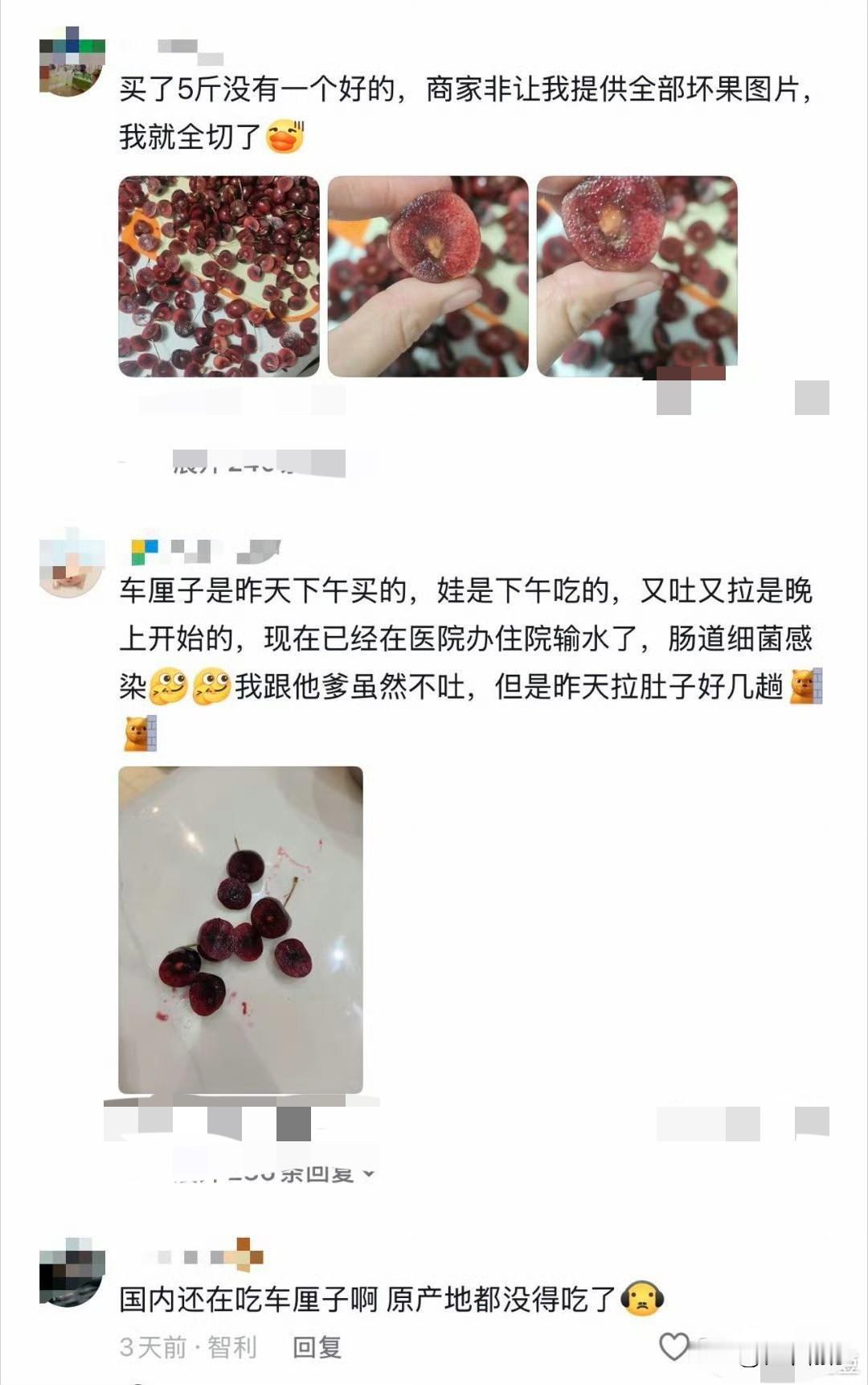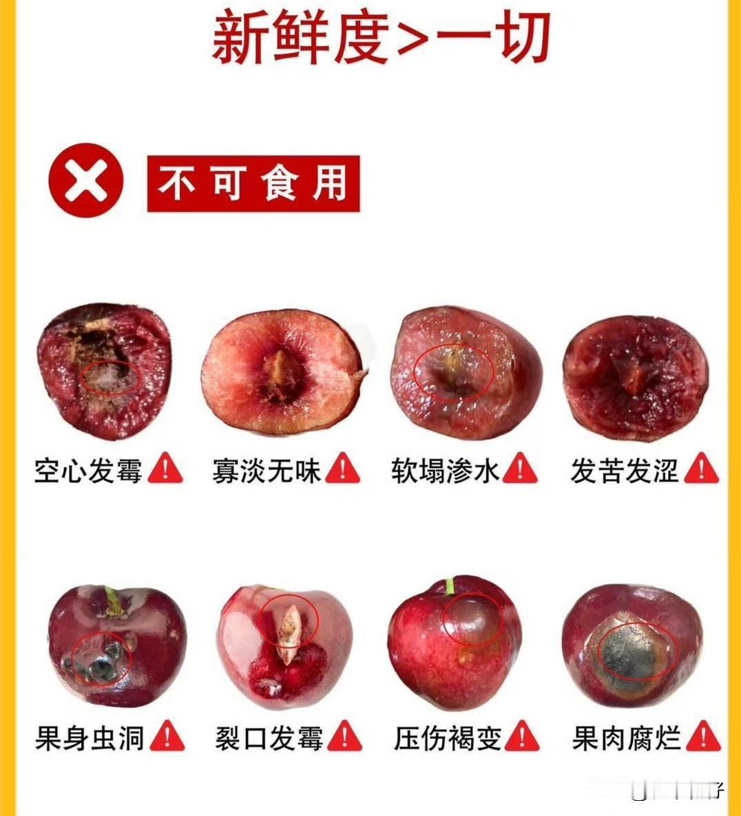 看到热搜,“爱吃车厘子的人天塌了”,虽然我不是很爱吃,但是也想点进去看看天怎么塌了。 看了半天热搜热议话题是说大量消费者反馈,近期购买的车厘子表面果柄翠绿、果皮硬挺光洁,但切开后果肉发黑发霉,口感发苦,还有的吃了以后拉肚子。暴露车厘子品质危机、健康风险和市场乱象三重冲击,让消费者从“自由狂欢”陷入焦虑。 如何挑选/判断车厘子的好坏: 1、新鲜度大于一切,好品种不等于好品质,不盲目追究品种。 2、不贪便宜,远远低于市场价的货,十有八九可能要踩雷。 3、首先按一下它的硬度,看一下它的枝头是否新鲜。 4、检查内里,内里发黑、吃起来酸苦的车厘子已经变质,不能吃。 信自己的眼睛和舌头就对了,烂不烂自己还不会判断吗?