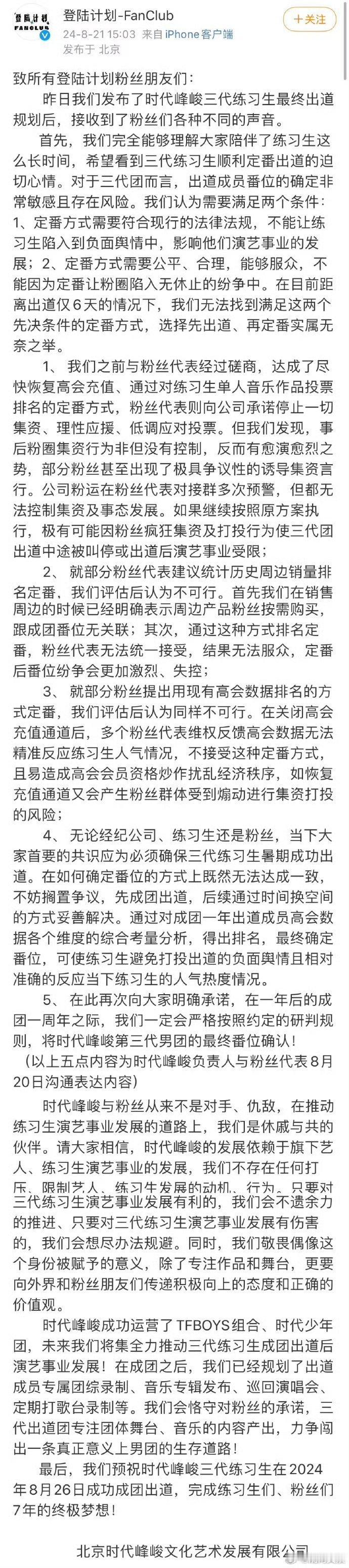 今日,官发长文回应番位争议称“公司从未内定过TOP登陆少年的番位,也从未主动撤回过加盖公章的定番承诺,所有决策的推进,均基于与粉丝的沟通及粉丝的投票选择。”