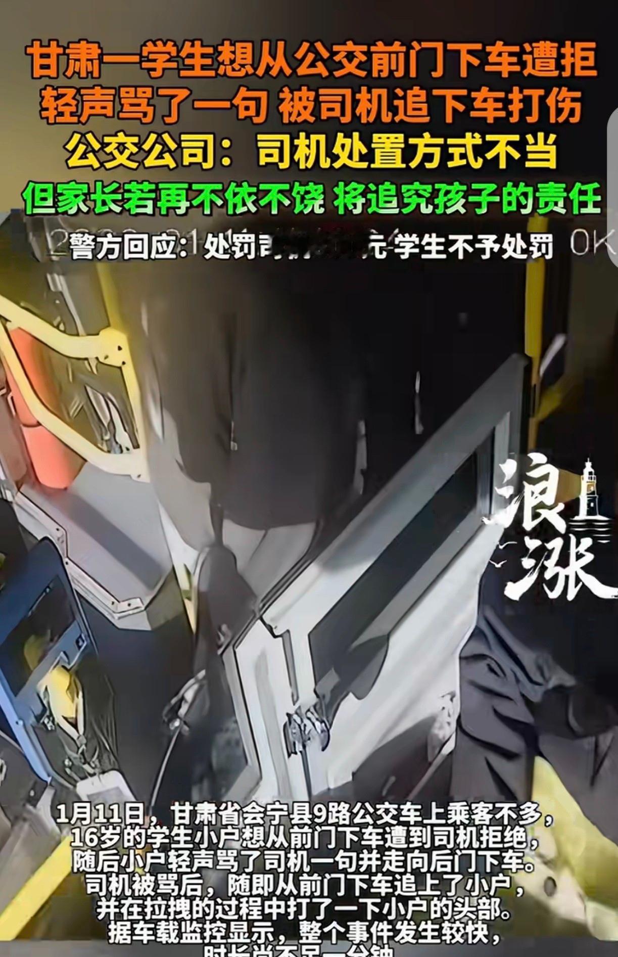 🌙甘肃,一16岁男孩坐公交车,他想从前门下车,司机不让,男孩轻声骂了一句,被司机追下车打了一顿,男孩父亲愤怒报警,说儿子出现“急性应激反应”患上重度焦虑症,要求司机赔钱。不料,公交公司回应:司机不对,但家长如果再不依不饶,将追究孩子的责任。 事件发生在2026年1月11日中午,小户放学乘坐当地9路公交车回家,上车后坐在紧邻司机座位的前门附近,全程并无过激举动。车辆行驶至瑞林苑路口公交站时,他走到司机身旁,先后三次要求打开前门下车,前两次司机未作回应,第三次才反问他“后门不能下吗?”。 小户之所以坚持从前门下车,并非故意违规,而是此前乘坐该线路公交时,遇到学生较多的情况,司机常会灵活打开前门供学生上下车,他早已习惯这种方式,再加上当天车内仅十几名乘客,并不拥挤,便没多想就提出了请求。 按照国内公交乘车规则,普遍实行“前门上车、后门下车”的规定,目的是维护乘车秩序、保障上下车安全,甘肃当地公交也沿用这一通行准则,司机拒绝小户的请求,从规则层面来看并无问题,只是没人料到,后续会引发肢体冲突。 被司机拒绝后,小户有些不满,转身走向后门时,低声嘟囔了一句脏话,随后便正常从后门下了车。他本以为这事就此翻篇,却没想到,这句轻声的咒骂,彻底激怒了42岁的涉事司机罗某某。 车载监控记录下了全过程,小户下车后,罗某某迅速解开安全带、打开驾驶位旁的防护栏,紧接着打开前门冲下车,快步追上已经走远的小户,一把将他向后推搡,随后用右手朝小户的头部挥去,整个过程不足一分钟,便被现场路人及时劝阻。 劝阻结束后,罗某某返回驾驶位继续运营,而小户则独自离开,直到回家后才将被打的事告诉父亲户先生。户先生又气又急,当即报警处理,还在三小时后带儿子前往会宁县人民医院就诊,初步检查结果显示,小户鼻部挫伤、双侧外耳道粘膜轻度充血。 本以为只是轻微外伤,没想到八天后,小户的精神状态愈发糟糕,出现失眠、恐惧、情绪失控等症状,户先生又带他前往兰州大学第二医院就诊,最终被诊断为“急性应激反应”“极重度焦虑症状”,后续还需长期心理干预。 经甘肃省会宁县公安司法鉴定中心鉴定,小户的伤情构成轻微伤,警方结合监控与双方陈述,依据《中华人民共和国治安管理处罚法》,对涉事司机罗某某作出罚款800元的行政处罚,考虑到小户系未成年人且情节轻微,对其不予处罚。 拿到处罚结果后,户先生向公交公司提出索赔,要求对方支付儿子的医疗费、心理治疗费,以及相应的精神抚慰金,可双方多次沟通,始终没能达成一致,矛盾逐渐升级,而公交公司的一番回应,更是引发了新的争议。 公交公司工作人员明确承认,罗某某的处置方式存在不当,称司机遭到辱骂后,本可通过口头教育或交由派出所处理,而非停车追打学生,此举已违反公司相关规定,目前正结合警方处罚结果,研判对罗某某的内部处分。 但与此同时,该工作人员也放出狠话,若户先生继续“不依不饶”,公司将考虑追究小户的相关责任,理由是小户在公交车上辱骂司机的行为,本身违反了《中华人民共和国治安管理处罚法》,还强调司机追打行为系个人冲动,与公司无直接关联。 这一回应瞬间引发网友热议,有人觉得公交公司是“避重就轻”,司机动手打人已是违法行为,却反过来威胁受害者家属;也有人认为,小户辱骂司机确实不对,只是双方的过错程度,显然不能相提并论。 在此次事件中,罗某某作为公交司机,肩负着整车乘客的安全保障义务,即便遭到辱骂,也应保持理性克制,其追打未成年人的行为,不仅违反治安管理规定,也违背了公交司机的职业准则,理应承担相应的民事赔偿责任。 值得注意的是,小户的心理创伤远比身体伤害更难愈合,极重度焦虑症需要长期治疗,后续的心理干预费用不菲,这也是户先生坚持索赔精神抚慰金的核心原因,而公交公司至今未对心理治疗相关的赔偿事宜作出明确回应。 截至目前,双方仍未就赔偿问题达成一致,事件还在进一步处理中。有人透露,公交公司已联系律师咨询相关事宜,大概率会通过法律途径解决纠纷,而户先生也表示,会坚决维护儿子的合法权益,不会轻易妥协。 这场因“前门下车”引发的纠纷,看似是一件小事,却牵扯出司乘素养、规则意识与法律责任等诸多问题。公交司机的理性处置、乘客的文明乘车,都是维护公共交通秩序的关键,任何一方的冲动,都可能引发无法挽回的后果。 那么此次事件中,司机动手与男孩辱骂,究竟是谁的过错更甚?公交公司以“追究孩子责任”为由施压,是否合理?你觉得双方该如何妥善解决这场纠纷,不妨留下你的观点,一起讨论。