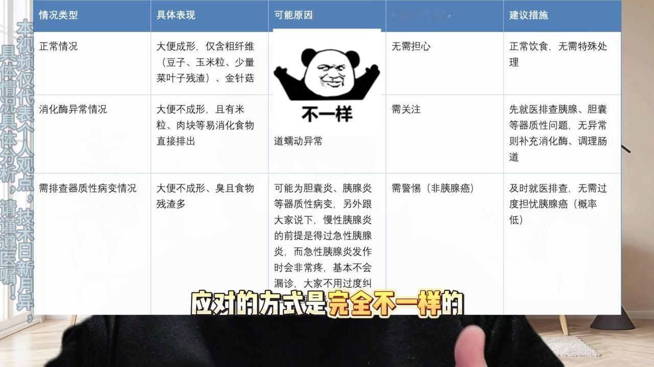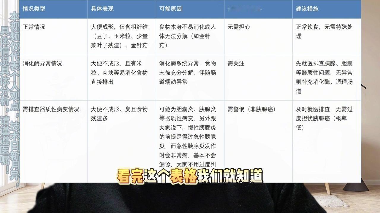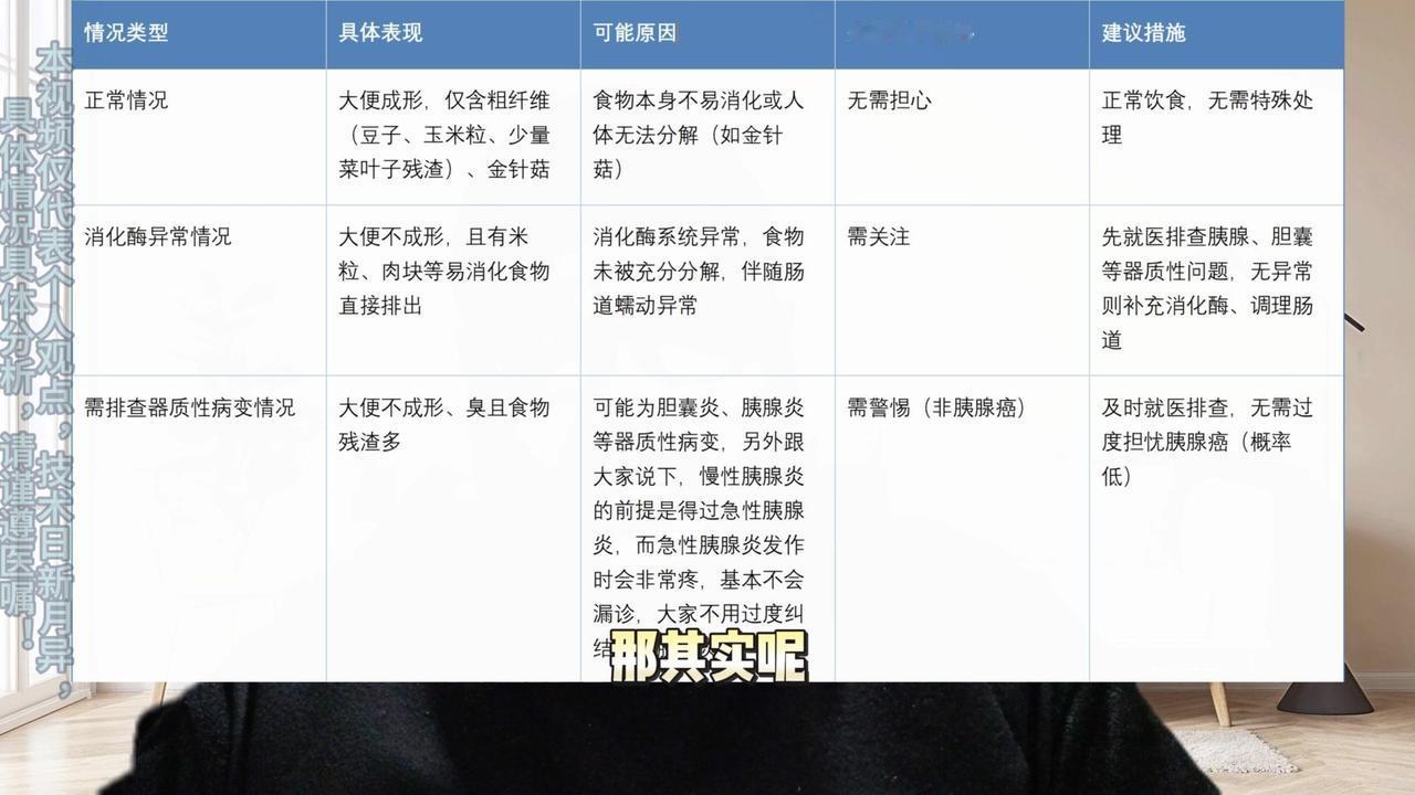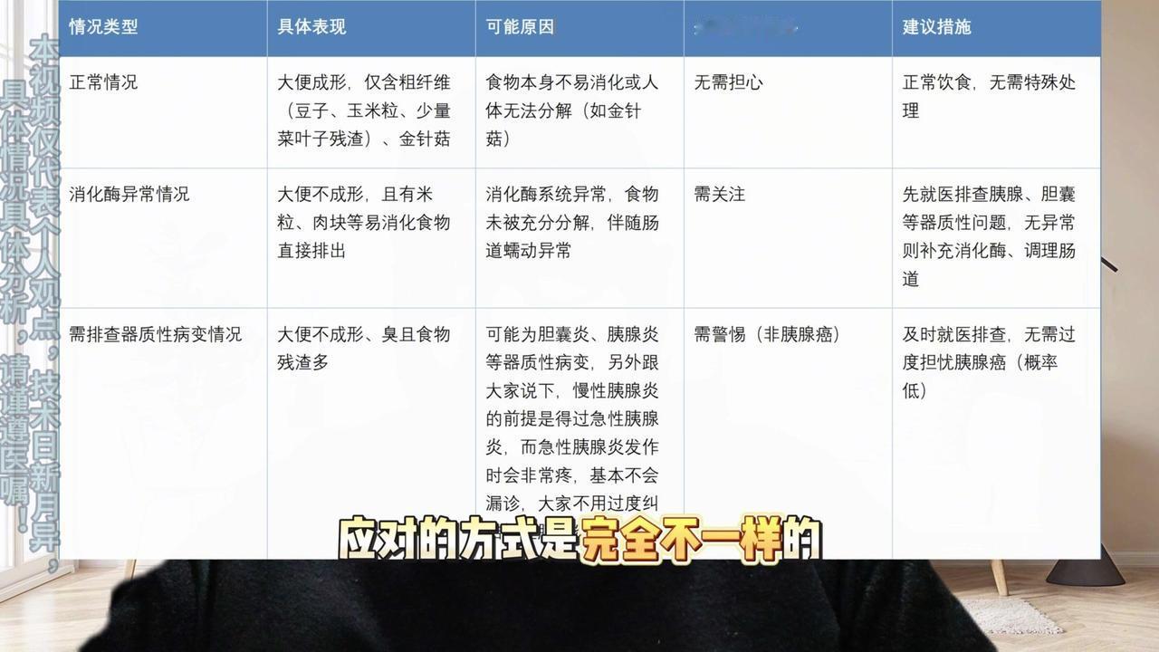 🌿先分清常见原因: 1️⃣吃了难消化的食物:比如粗纤维蔬菜、豆子、玉米、金针菇等,残渣是正常的,只要没酸臭味、没不适就不用在意。 2️⃣消化酶不够:如果吃进去的米粒、肉块等易吸收食物直接排出,且味道酸臭,可能是消化酶不足,伴随肠道功能紊乱,需要排查肝脏、胆囊、胰腺问题。 另外,胰腺癌高发年纪在40岁以上,年轻人不必过度担心。慢性胰腺炎通常有急性发作史,疼痛厉害,没病史不用纠结。 如果检查没器质性问题,大概率是功能性消化不良或肠道蠕动异常,补充消化酶、益生菌,规律作息、适度运动就能改善。别因焦虑陷入恶性循环,放松心态更重要。