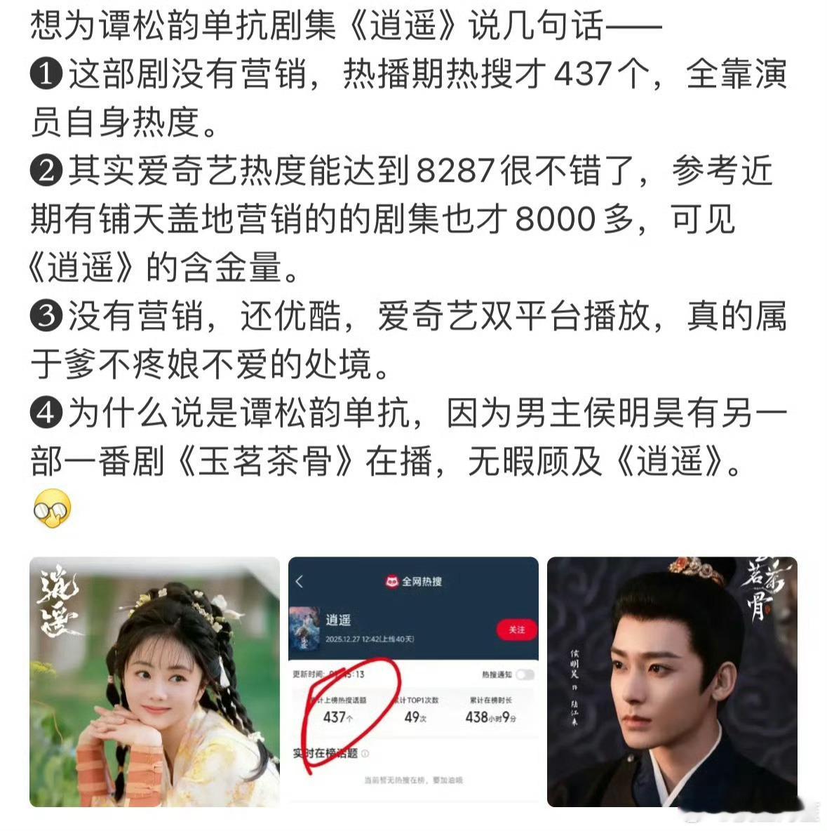 谭松韵粉丝和侯明昊粉丝在争逍遥这部剧是谁扛的……这部剧播的时候成绩其实很一般吧,