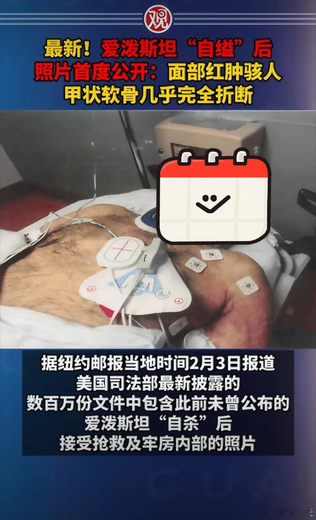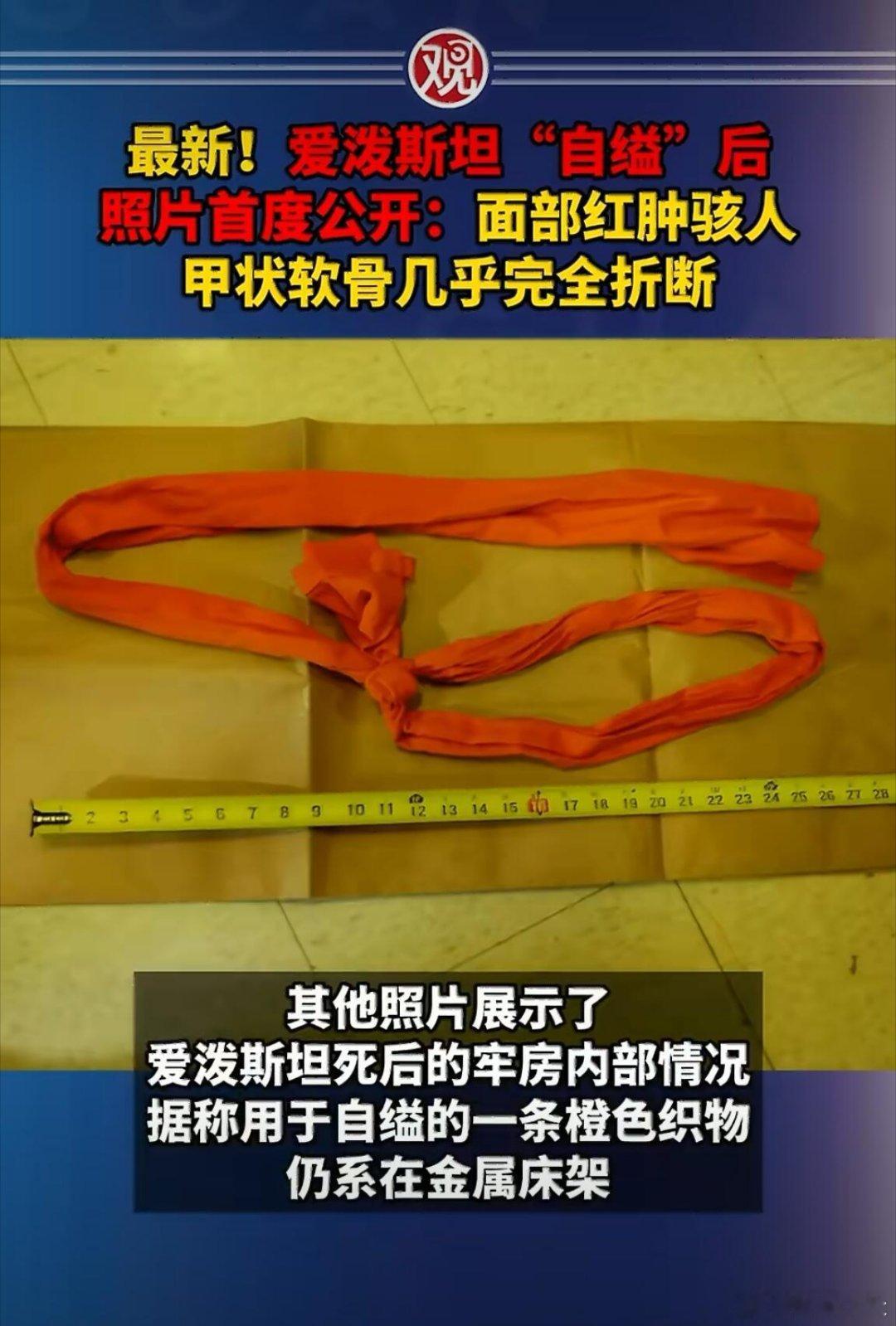 爱泼斯坦自缢后照片首度公开爱泼斯坦自缢后照片首度公开世界上没有一个人相信爱泼斯坦是自杀的!上岛的每一个人都希望他死!每一个人都有能力,也有意愿将他置于死地!杀人灭口,对他们是最迫切的,而且是最直接的手段!所以爱泼斯坦死后,上岛的人没有一个,进入司法审判!这就是西方权贵的手段!