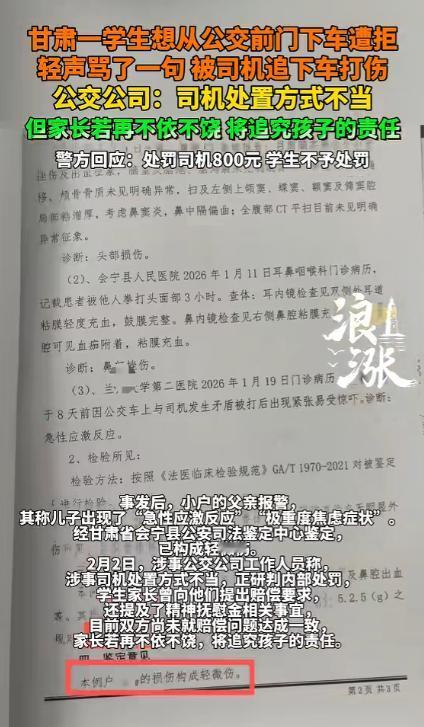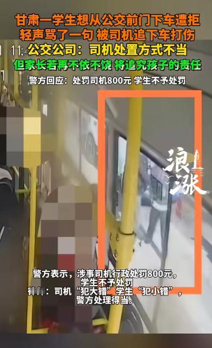 甘肃,一16岁男孩坐公交车,他想从前门下车,司机不让,男孩轻声骂了一句,被司机追下车打了一顿,男孩父亲愤怒报警,说儿子出现“急性应激反应”患上重度焦虑症,构成轻微伤,要求司机赔钱,并支付精神抚慰金。不料,公交公司回应:司机不对,但家长如果再不依不饶,将追究孩子的责任。 甘肃,一场因公交车引起的纠纷事件,成为了不少网友关注的重点,一名16岁的男孩小户(化名)坐这趟 9 路公交上学放学快一年了。 平日里赶上学生扎堆的放学时段,司机总会主动打开前门让学生快速上下车,这是没明说却大家都默认的习惯。当天车上只有十来个乘客,不算拥挤,车辆到站后,小户走到驾驶位旁,连着三次询问司机能不能开前门下车。 前两次的询问都没得到回应,第三次才等来司机一句干脆的 “后门下”。没有多余的解释,小户没再争辩,转身朝后门走的路上,嘴里轻声嘟囔了一句脏话,声音小到旁边的乘客都没听清,随后他便按规矩从后门下了车,脚刚落地,车门还没完全关严,意外就发生了。 听见那声轻不可闻的咕哝,当班的罗师傅当下就红了眼,二话不说解开了身上的安全带,一把推开驾驶位旁的防护栏,快步拉开前门就冲了下去,也就追了两米远,就追上了正拎着书包带往前走的小户。 那会儿小户连头都没回,更没半点要和司机争执、反抗的意思,罗师傅上去就一把推在他的肩膀上,紧跟着右手一拳就狠狠砸在了小户左耳上方的位置。 整个动手的过程,都被车上的监控拍得明明白白,没有半点儿遗漏,从司机冲下车到动手打人,再到路边的路人赶紧上来拉架劝阻,前后加起来还不到六十秒,罗师傅被劝开后,一言不发转身就回了驾驶位,只留小户一个人愣在原地,捂着被打的地方,半天没回过神来。 孩子平白无故被打,消息传到小户父亲耳朵里,他又心疼又气愤,当场就掏出手机报了警,生怕耽误孩子的检查,事发后不到三个小时,就带着小户赶到医院做了全面的身体检查。 本以为只是简单的皮肉伤,养上几天就能好,可谁想 8 天过去,小户的状态越来越差,饭吃不下,觉也睡不着,整个人蔫蔫的,家人赶紧又带着他赶到兰州大学第二医院做进一步的详细检查,这次的就诊证明,让一家人的心彻底揪了起来。 小户出现了急性应激反应,医生在病历上特意备注,孩子出现了场景闪回、入睡困难的情况,还会下意识回避公交站这类相关场景。 涉事公交公司的工作人员明确表示,已经全面知晓 1 月 11 日发生的这起司机殴打学生的事件,并且毫不避讳地承认,涉事的罗师傅在这件事上的处置方法,存在明显的不当和失误。 工作人员称,司机在遭到学生的辱骂后,本有多种合理、合规的解决方式,比如当场进行口头教育,或者直接联系派出所,将事情交由警方处理,而非临时停车,冲动之下追下车去殴打学生。 这样的行为,已经严重违反了公司的相关规章制度,目前公司正结合警方的最终处理结果,对罗师傅的内部处罚事宜进行全面研判,后续会出台具体的、正式的处理意见。 只是这份回应里,还有着让小户家人难以接受的内容,工作人员表示,目前双方还没有就赔偿的相关事宜达成一致,公司也正在和律师就此事进行详细的沟通咨询。 而对于小户父亲的相关诉求,对方直言,如果家长再继续不依不饶,公司或将考虑追究这名学生的相关责任。 而警方这边,也已经出具了正式的行政处罚决定书,对这起事件给出了明确的处理结果,决定给予涉事的罗师傅罚款 800 元的行政处罚,而对于涉事的 16 岁学生小户,警方则作出了不予处罚的决定。 警方给出的详细解释是,小户的辱骂行为情节显著轻微,而且该行为发生在其下车的过程中,并未实际妨碍公交车的正常行驶,也没有危及到车上乘客的公共安全。 再加上其尚未成年的身份,按照相关的法律规定,对其作出不予处罚的决定,完全符合教育、感化、挽救的未成年人处理基本方针。 公共出行的方寸之间,藏着人与人之间的相处之道,也考验着公共服务的温度与底线。对于公交司机而言,手握方向盘,肩负着全车人的安全,更该学会管理情绪、理性处事。 对于未成年人,需要学会遵守规则、文明表达;而对于公交公司,完善员工的情绪管理和服务培训,兼顾规则的刚性与服务的柔性,才是避免此类纠纷的关键。 对于这件事,您有什么想说的吗?欢迎评论区留言讨论。 信源:浪涨新闻2026-02-03——《甘肃一学生想从公交前门下车遭拒,轻声骂了一句 被司机追下车打伤。公交公司:司机处置方式不当……》
