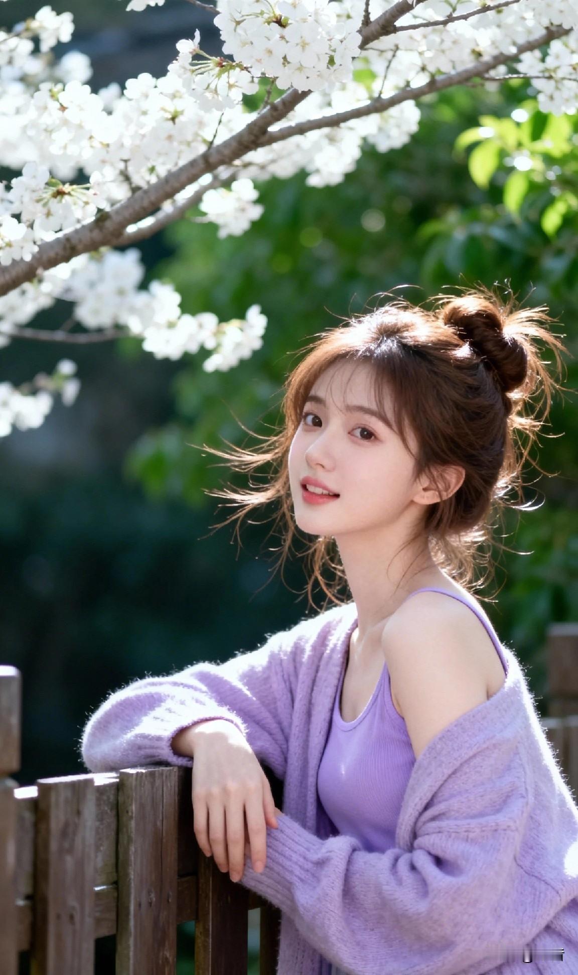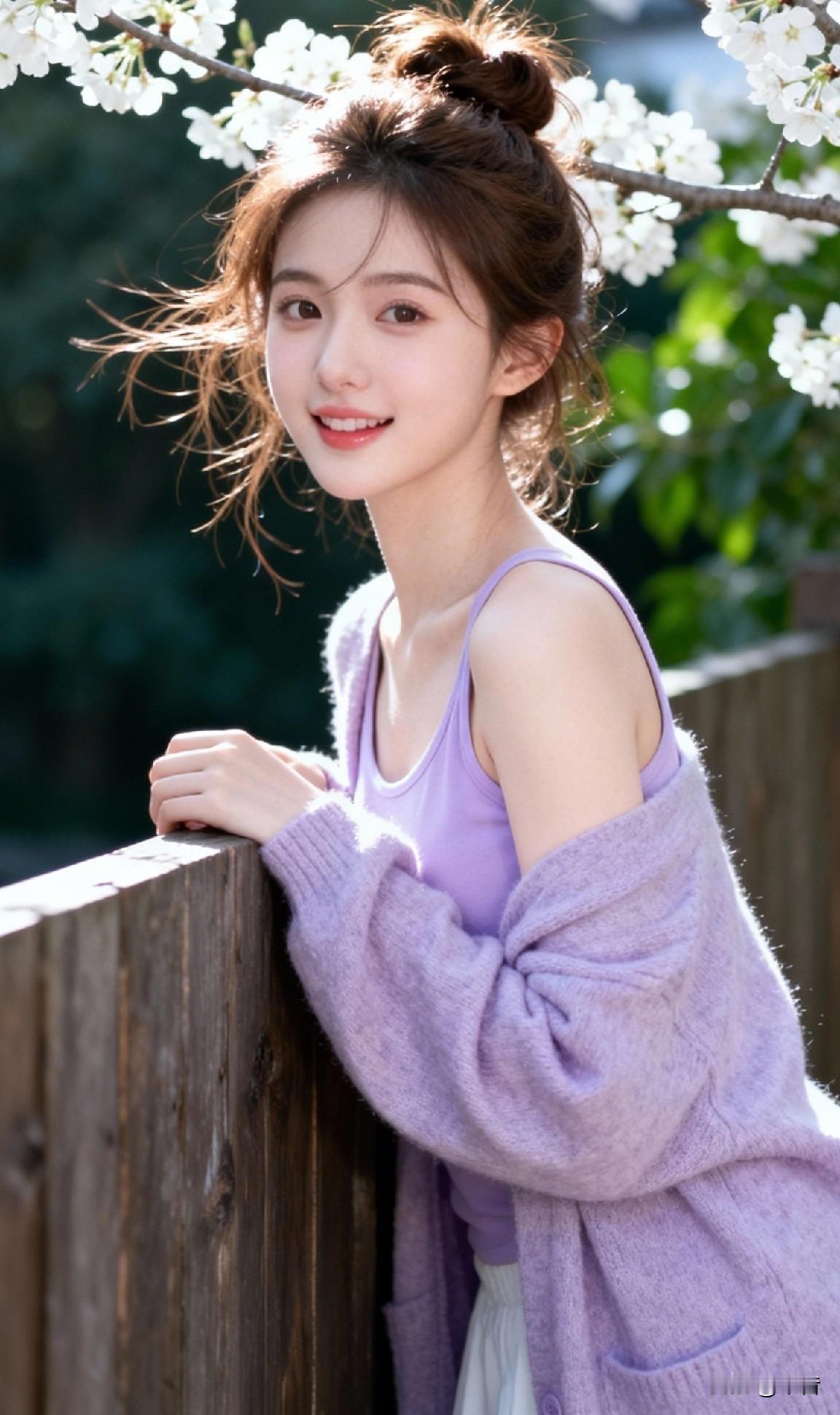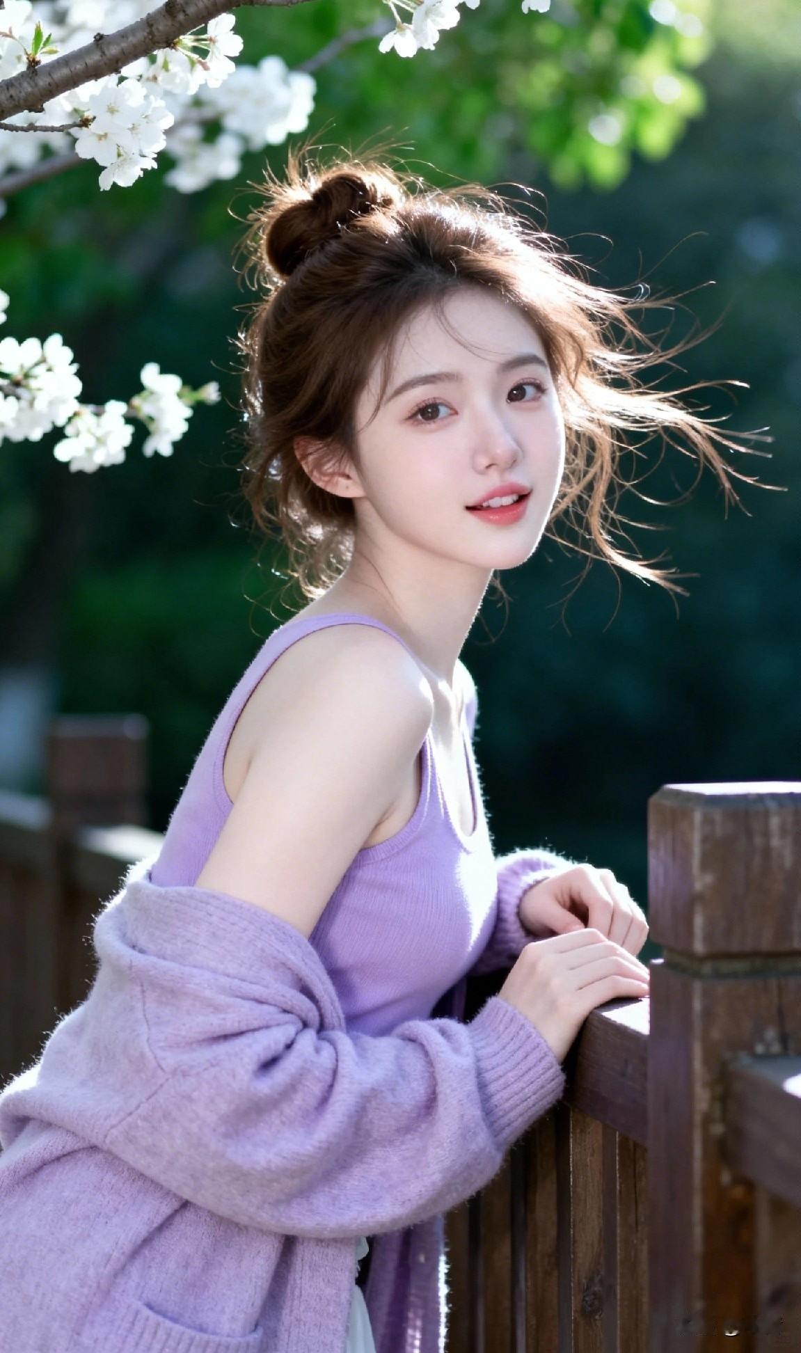 风一吹 发丝就飘起来 光一跳 皮肤就透出瓷白 浅紫开衫倚着木栏晃呀晃