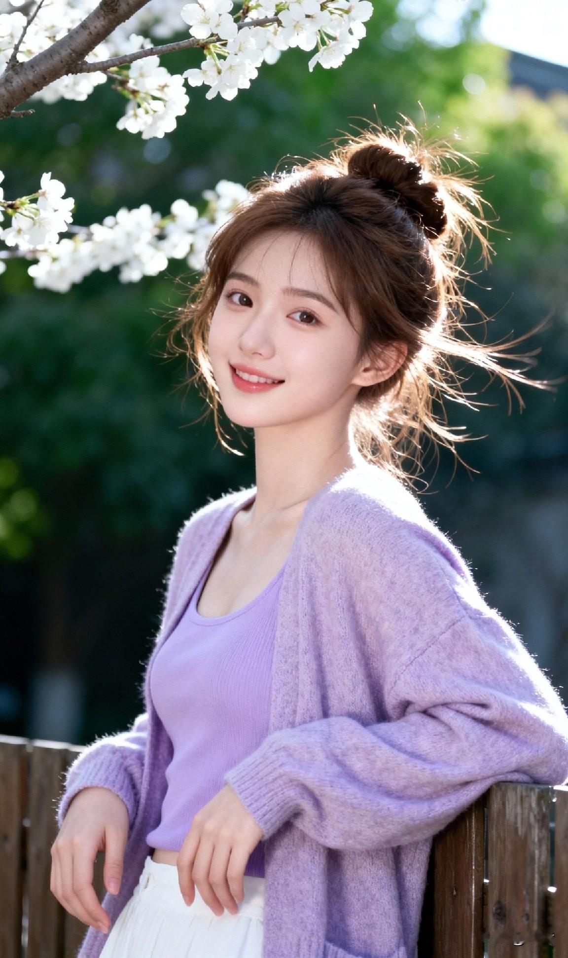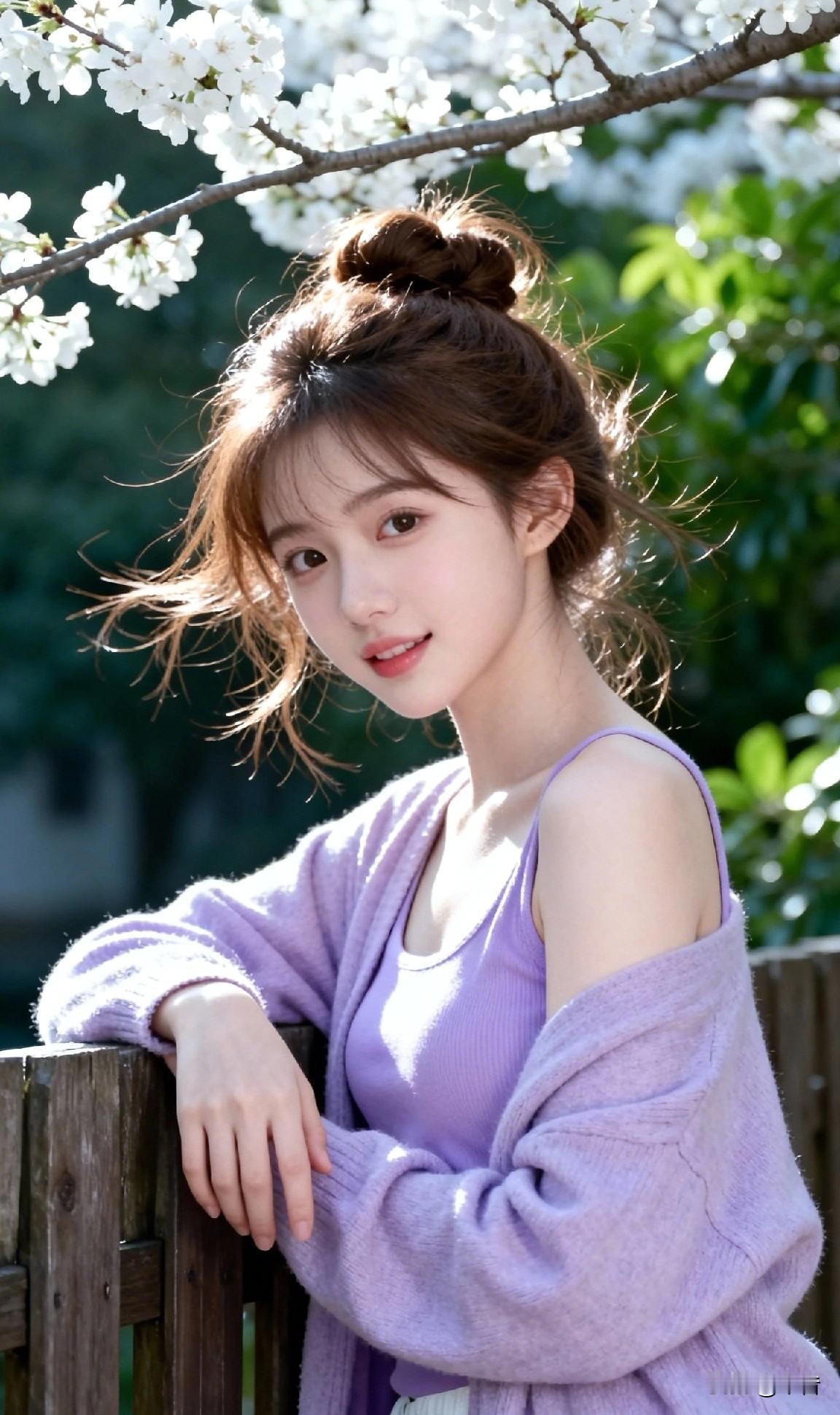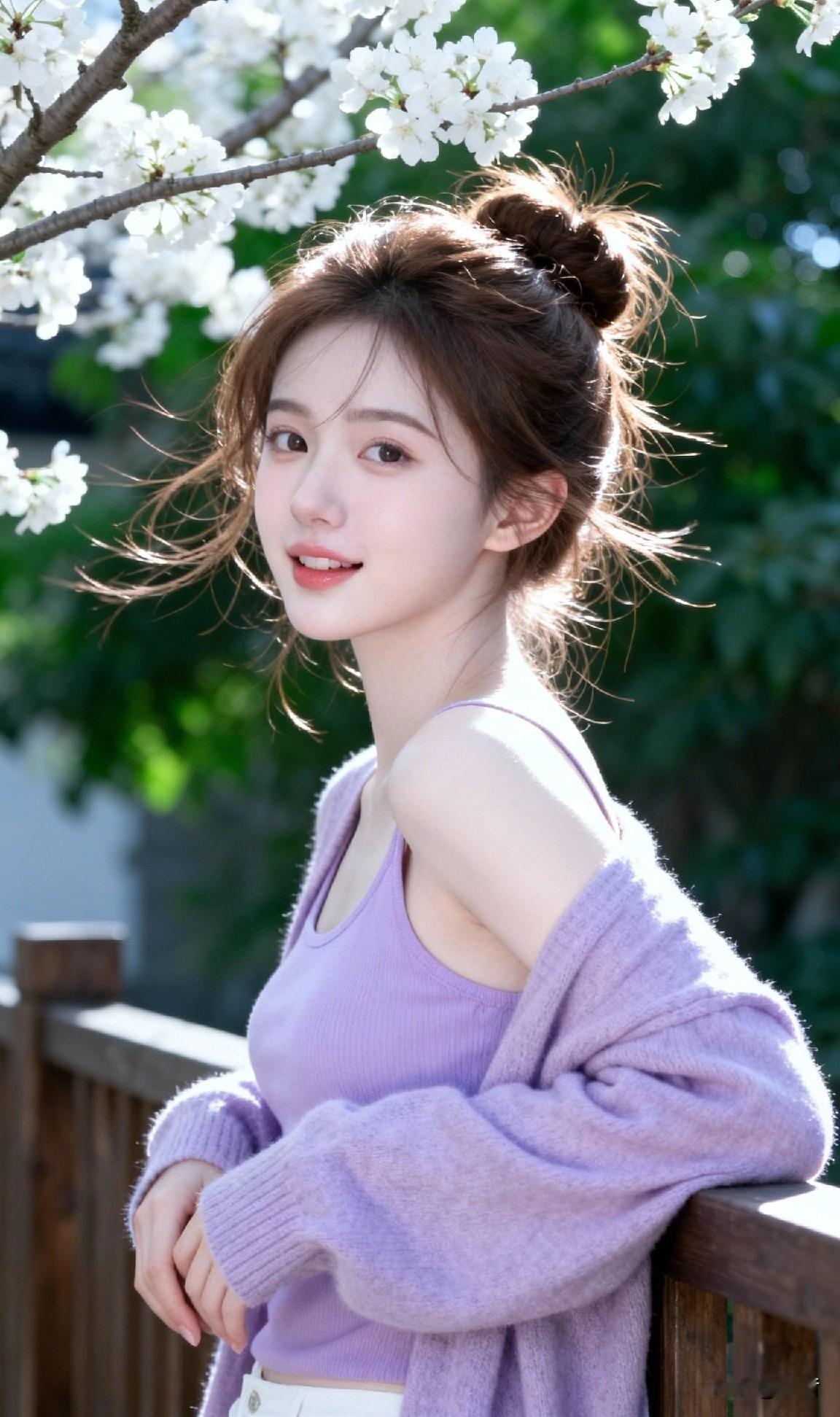 风一吹 发丝就飘起来 光一跳 皮肤就透出瓷白 浅紫开衫倚着木栏晃呀晃