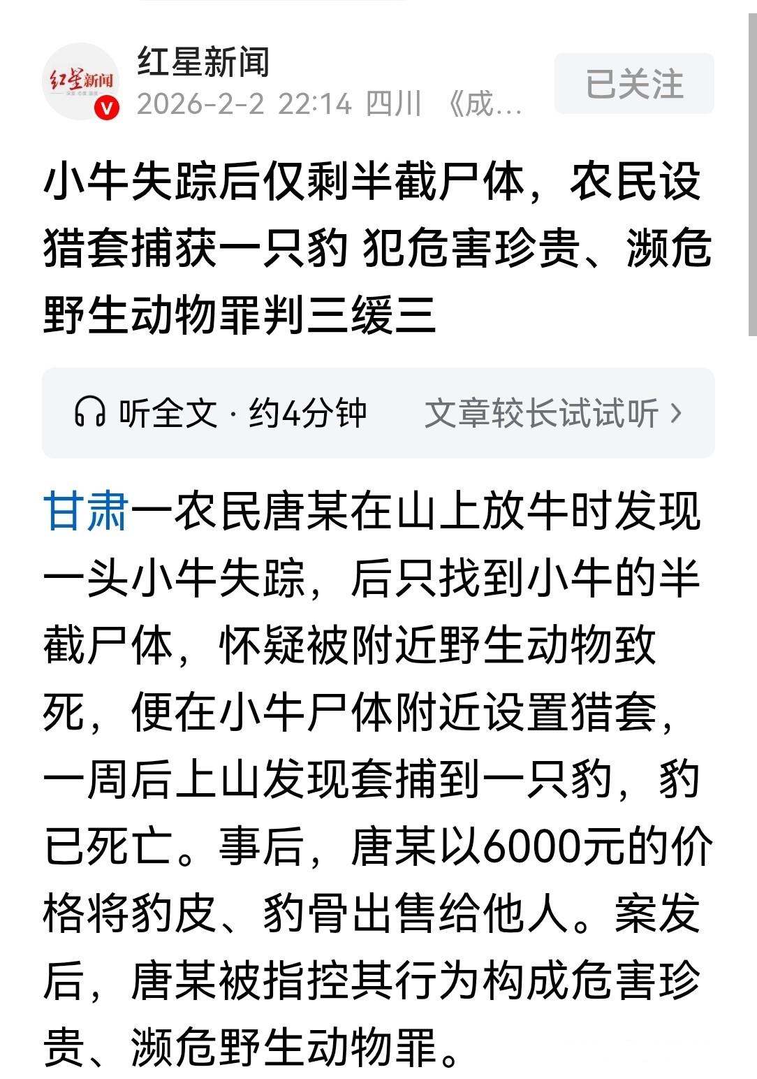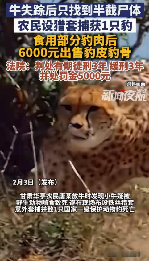 甘肃平凉,农民唐某,一只小牛被野兽杀害。愤怒下唐某设下猎套,抓到一只豹子,将其杀掉,剥皮去骨,卖掉6000元。结果这只豹子是保护动物,唐某被判刑3年。 唐某,甘肃一名普通农民,靠养牛为生。在2018年7月,唐某发现自己的牛群中少了一头小牛。当他在山中寻找时,终于在灌木丛中找到了只剩半截的牛尸体,显然是被野生动物袭击所致。唐某既心疼又愤怒,他推测可能是附近山中的野兽,如狼或豹,袭击了这头小牛。尽管他没有直接想到豹子,心中的愤怒促使他采取了报复性的行为:他制作了一个铁丝猎套,将其放置在小牛尸体旁边,希望捕捉到可能的凶手。 一周后,唐某再次上山检查,远远地看到猎套中有一个黄黑斑纹的物体。走近一看,竟然是一只豹子,已经被猎套勒死。唐某感到震惊,但又因心中不舍,决定将豹子的皮毛和骨架带回家。后来,唐某将这张豹子皮和骨架以6000元的价格卖给了一名陌生人赵某。然而,这场看似无意的捕杀和买卖,却引发了严重的法律后果。 根据《中华人民共和国野生动物保护法》第21条的规定,禁止猎捕、杀害国家重点保护野生动物。豹子是国家一级保护动物,唐某在没有猎捕许可的情况下,使用铁丝猎套非法捕杀并买卖豹子皮和骨,这一行为无疑违反了法律。无论唐某的初衷是什么,法律对猎捕、杀害保护动物有着严格的规定。 唐某虽然出于“报复”动机,但其行为已经构成了非法猎捕珍贵、濒危野生动物的罪行。具体来说,唐某非法捕杀的豹子属于国家一级保护动物,且其所获得的豹子皮和骨架在市场上的非法价值高达40万元一只,属于“情节严重”。根据《野生动物保护法》以及《刑法》的相关规定,非法猎捕保护动物的行为通常会导致较为严重的刑事责任。 唐某的行为不仅违反了法律,也对环境保护、野生动物资源造成了不可忽视的损害。豹子作为生态系统中的重要成员,具有独特的生态价值和生物多样性保护意义。非法猎捕这样的物种,不仅扰乱了生态平衡,也让珍稀物种的生存面临威胁。保护这些物种不应只是法律的要求,更是社会责任的体现。 此外,这一事件也反映出部分地方农民对野生动物保护法律的不了解以及对生态保护的重要性的认识不足。唐某因为对保护动物的法律知识缺乏了解,才做出了如此不理智的决定。法律的无知并不能成为免除责任的借口,这一案件为其他农民和公众敲响了警钟:了解法律、尊重法律,才能避免触犯法律红线,保护自己和环境。 在案件的审理过程中,唐某主动向警方投案,并且如实交代了自己的行为。他承认捕杀豹子并出售豹皮豹骨的事实,并且退还了通过非法交易获得的6000元违法所得。根据中国《刑法》规定,犯有危害珍贵、濒危野生动物罪的被告人,如果主动投案并如实供述,可以依法减轻处罚。唐某的自首、认罪认罚行为,得到了法院的考虑,最终被判处3年有期徒刑,缓刑3年,并处罚金5000元。 法院在量刑时,考虑到唐某的犯罪动机并非直接追求非法获利,而是由于一头小牛失踪后产生的报复心理。尽管如此,唐某的行为依然构成了严重的违法行为,且猎捕的豹子属于国家一级保护动物,因此法院判定其犯罪行为应当受到法律的惩罚。 唐某的案件给社会带来了重要的警示意义。首先,对于广大农民和乡村居民来说,虽然部分地区与野生动物接触较多,但必须清楚认识到,野生动物的保护是国家和社会的共同责任。无论是出于自卫还是经济利益,任何非法猎捕、杀害保护动物的行为都是不可接受的。每个人都应该意识到,违法的行为将不仅给自己带来法律惩罚,也会对生态环境产生深远的影响。 其次,唐某的案件也说明了公众对法律的知识储备非常重要。很多人因为无知或误解,往往在面临问题时做出过激行为,进而导致不可挽回的后果。法律不仅是规范社会行为的工具,更是保护每个人和社会整体利益的屏障。了解并尊重法律,避免因无知而违法,是每个公民应尽的责任。 无论是为了自己、为了家庭,还是为了地球上的每一只动物,尊重和遵守法律,已经成为我们不可推卸的责任。
