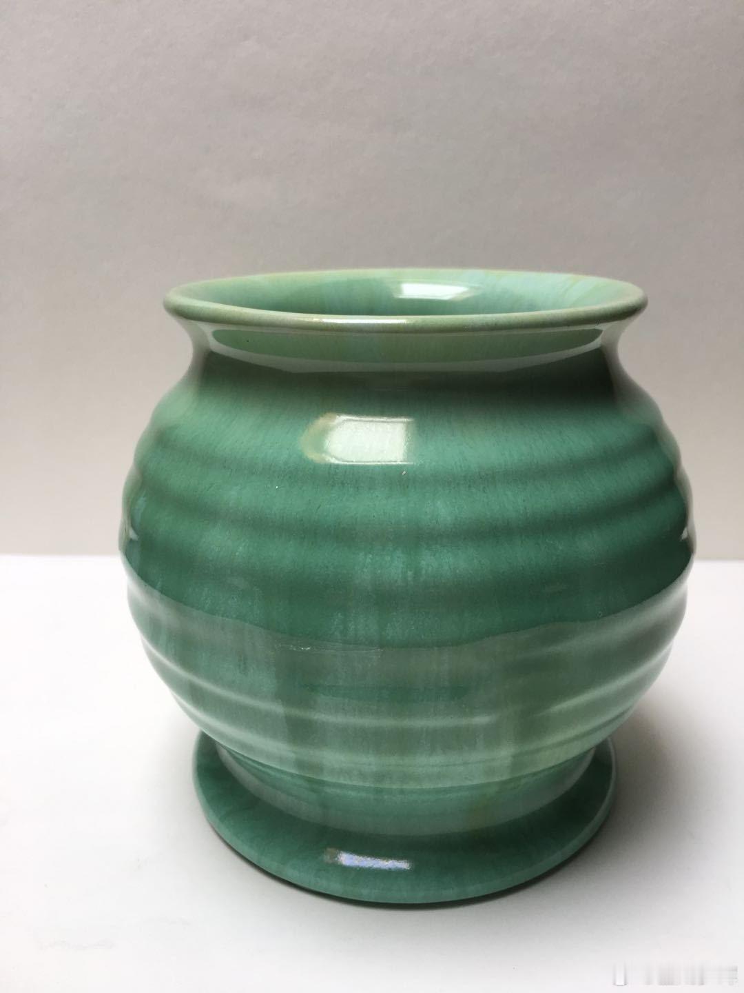 每周鉴赏收藏精品之金代钧窑窑变釉弦纹尊 本件金代钧窑窑变釉弦纹尊,翠色盎然。我们知道,金代掌管钧窑的前期,钧窑烧造了一些釉面光亮的窑变釉瓷器,也算是钧窑瓷器的高光时刻之一。这在窑址地层的残片中也得到印证。 本件金代钧窑窑变釉弦纹尊,可能就是其中之一。金代仿效北宋做祭祀用的瓷器礼器,在器型上是没有问题的。青铜器瓿的造型,浑厚沉稳,大气磅礴。虽然没有北宋祭祀瓷器那么高挑挺拔,但也符合金代统治者的喜好。 本件窑变釉弦纹尊,最大的看点就是主体釉色,属于苹果绿的亮绿色,这在宋金时期钧窑是非常困难和稀少的。虽然没有清康熙时期郎窑绿那么翠性(图五所示),也已经是很不容易的了。 从窑变效果看,除底色绿釉外,窑变出青白、黄、褐等色的竖状细丝兔毫,与器身横向弦纹构成纵横交错的釉面效果。其艺术表现力还是很明显的。所以,鉴赏价值不言而喻。 从窑口辉煌度方面看,北宋钧窑前期明亮釉、宋徽宗时期单色釉、金代时的光亮釉,是宋金时期的三个高光时刻。其烧造的精品瓷器精致耐看,是值得收藏,鉴赏和传承。