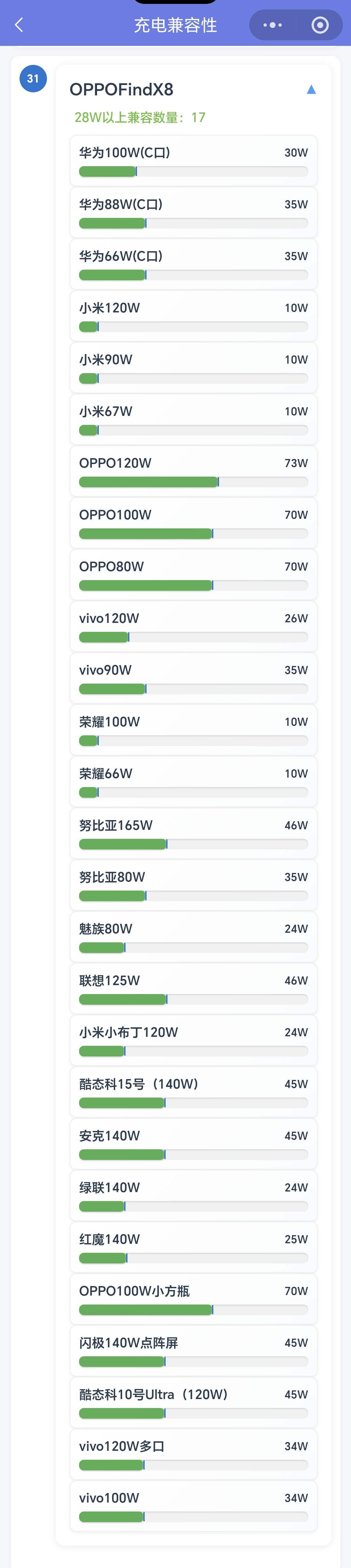 近期OPPOFindX8系列,一加13系列收到了16.0.3.501版本推送,新增手机支持55W PPS充电协议。我们更新后复测充电兼容性,发现努比亚165W,努比亚80W,联想125W,酷态科15号,安克140W,闪极140W点阵屏,酷态科10号Ultra这7款第三方充电器的充电兼容性有所提升。 以OPPOFindX8为例: 努比亚165W从原来的24W提升到了46W 努比亚80W从原来的24W提升到了35W 联想125W从原来的24W提升到了46W 酷态科15号从原来的24W提升到了45W 安克140W从原来的24W提升到了45W 闪极140W点阵屏从原来的27W提升到了45W 酷态科10号Ultra从原来的27W提升到了45W 以后使用OPPOFindX8系列和一加13系列用户出门可以只带一个第三方PPS高功率充电头了 更多充电兼容性数据,请访问新评科技数据库小程序。
