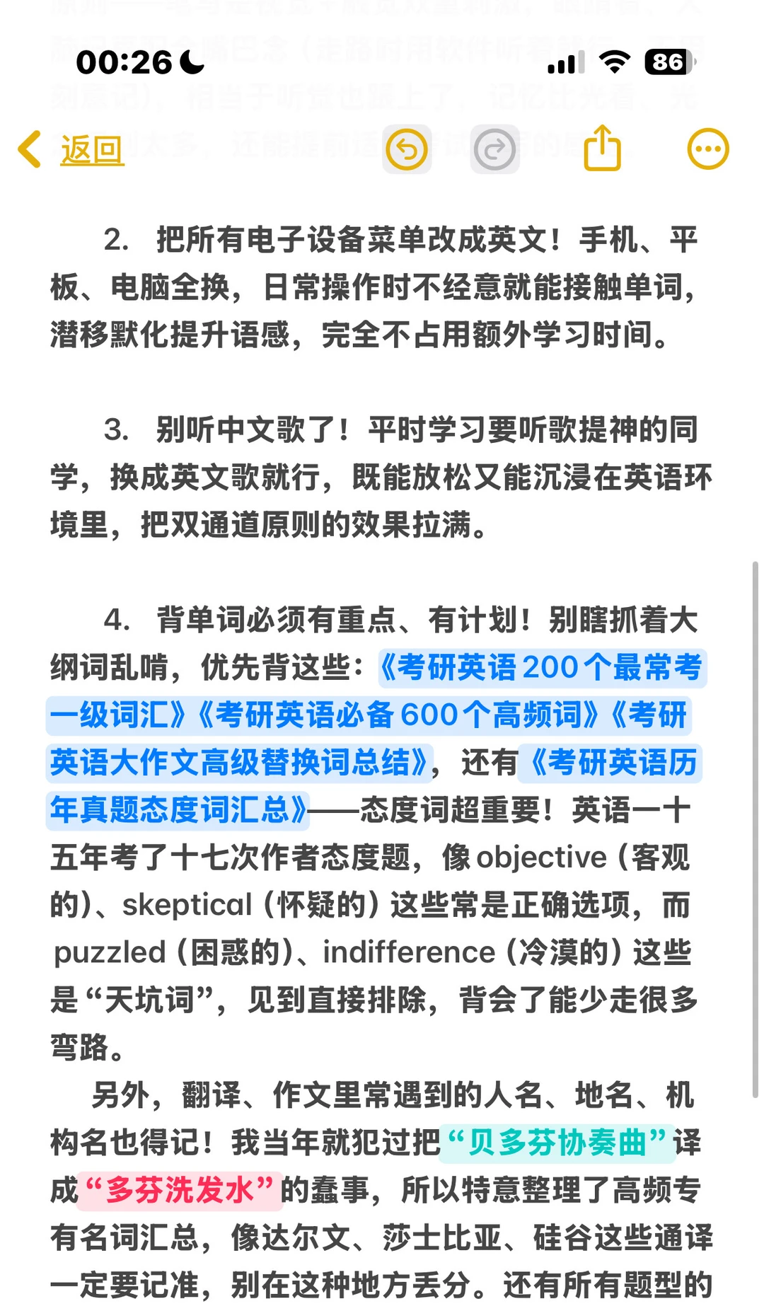 4. 背单词必须有重点、有计划!别瞎抓着大纲词乱啃,优先背这些:《考研英语200个最常考一级词汇》《考研英语必备600个高频词》《考研英语大作文高级替换词总结》,还有《考研英语历年真题态度词汇总》——态度词超重要!英语一十五年考了十七次作者态度题,像objective(客观的)、skeptical(怀疑的)这些常是正确选项,而puzzled(困惑的)、indifference(冷漠的)这些是“天坑词”,见到直接排除,背会了能少走很多弯路。