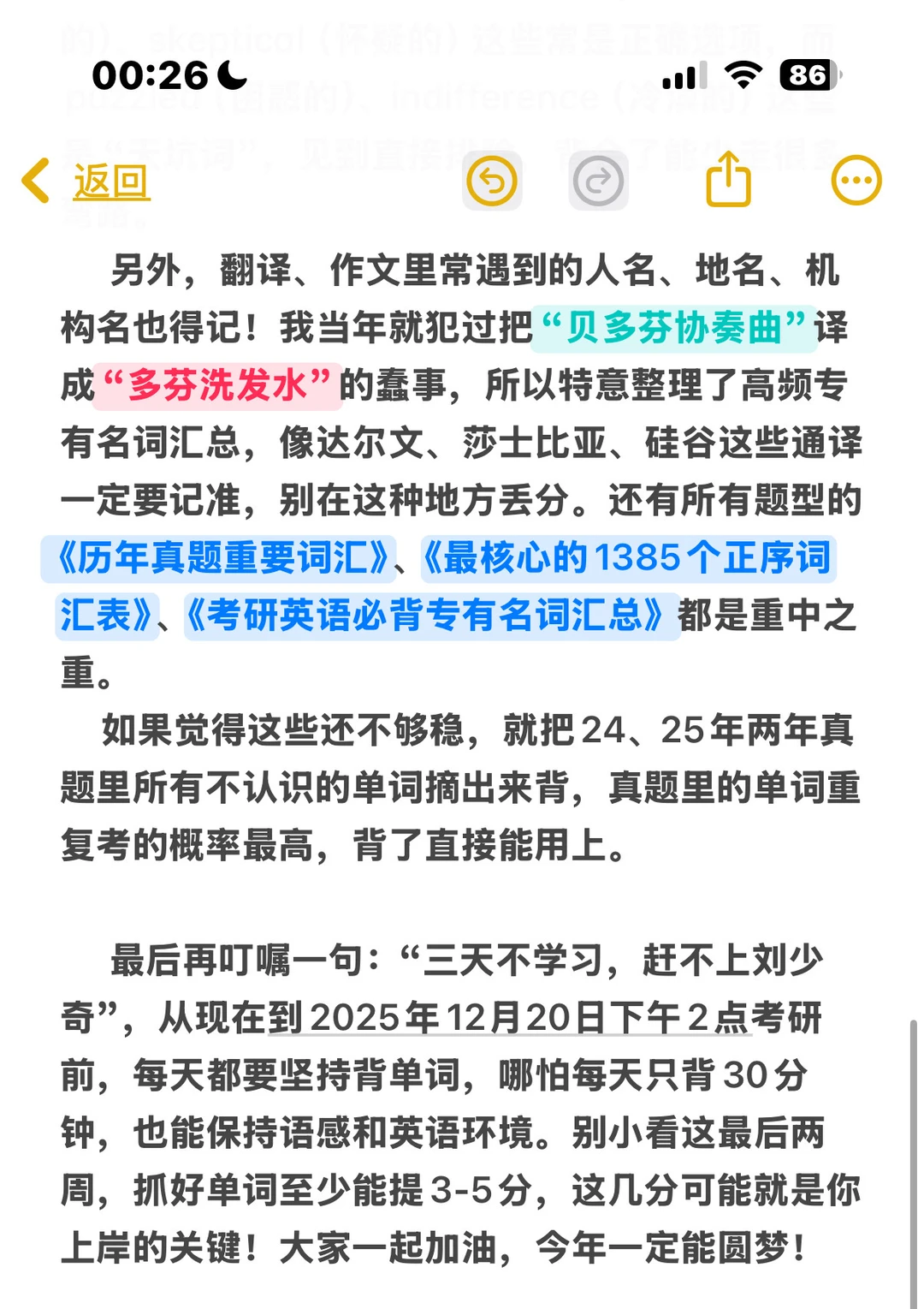 最后再叮嘱一句:“三天不学习,赶不上刘少奇”,从现在到2025年12月20日下午2点考研前,每天都要坚持背单词,哪怕每天只背30分钟,也能保持语感和英语环境。别小看这最后两周,抓好单词至少能提3-5分,这几分可能就是你上岸的关键!