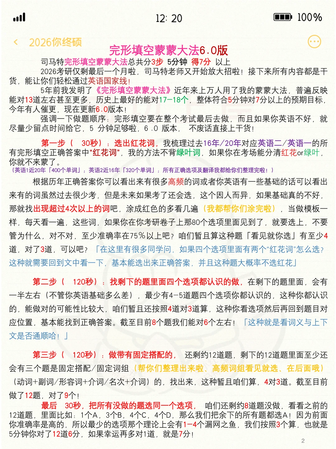 5年前我发明了《完形填空蒙蒙大法》近年来上万人用了我的蒙蒙大法,普遍反映能对13道左右甚至更多,历史上最好的能对17-18个,整体符合5分钟对7分以上的预期目标,今年有人催更,现在更新6.0版本
