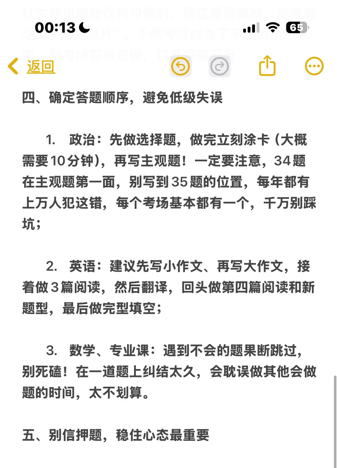 1. 政治:先做选择题,做完立刻涂卡(约10分钟),再写主观题,切记34题在主观题第一面,别写到35题位置,每年都有上万人踩坑