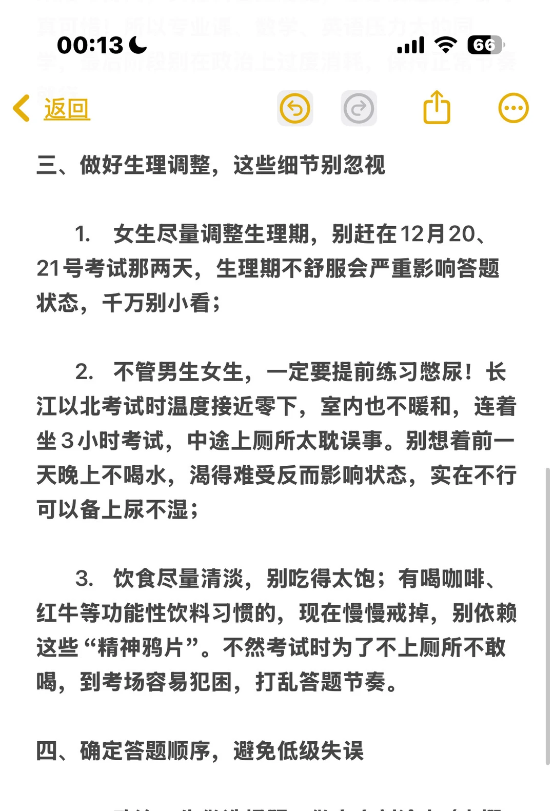2. 无论男女,提前练习憋尿!长江以北考试时温度接近零下,室内也不暖和,连续坐3小时考试,中途上厕所太耽误事,前一晚不喝水会口渴影响状态,实在不行可备尿不湿