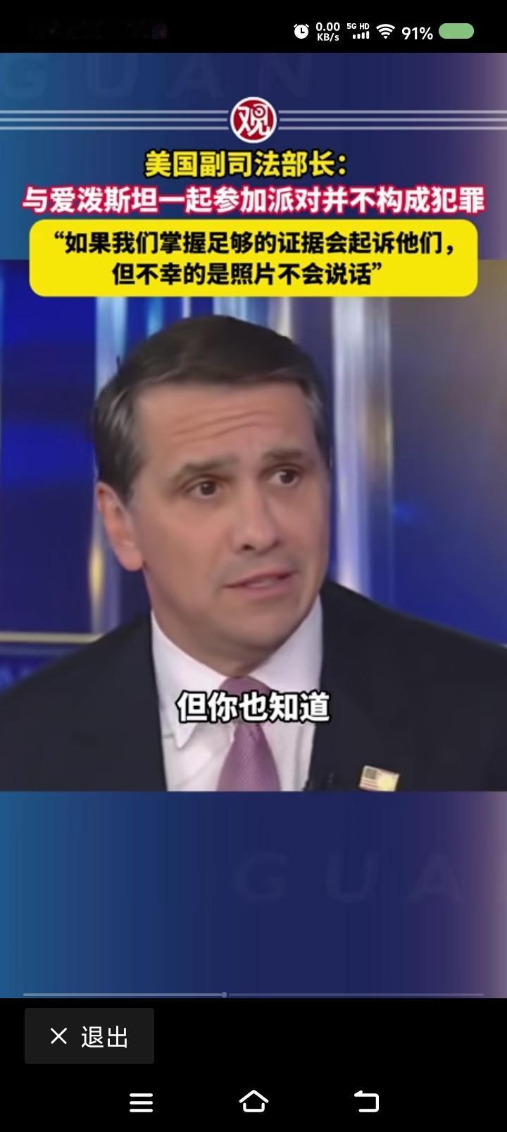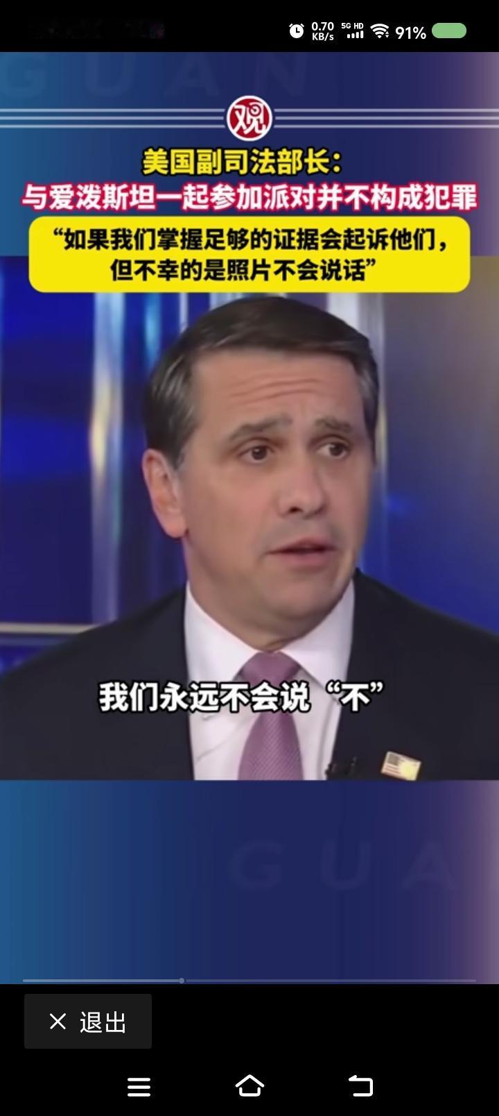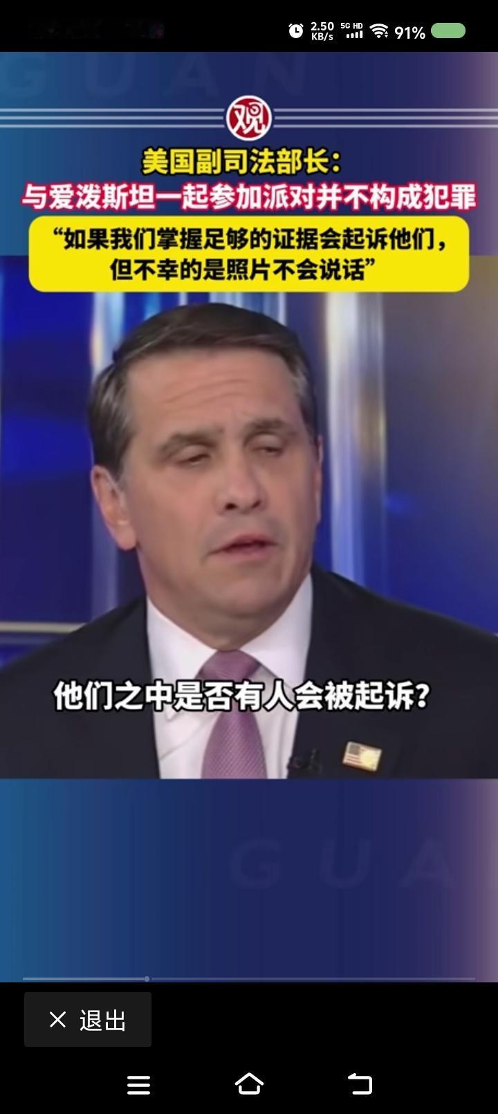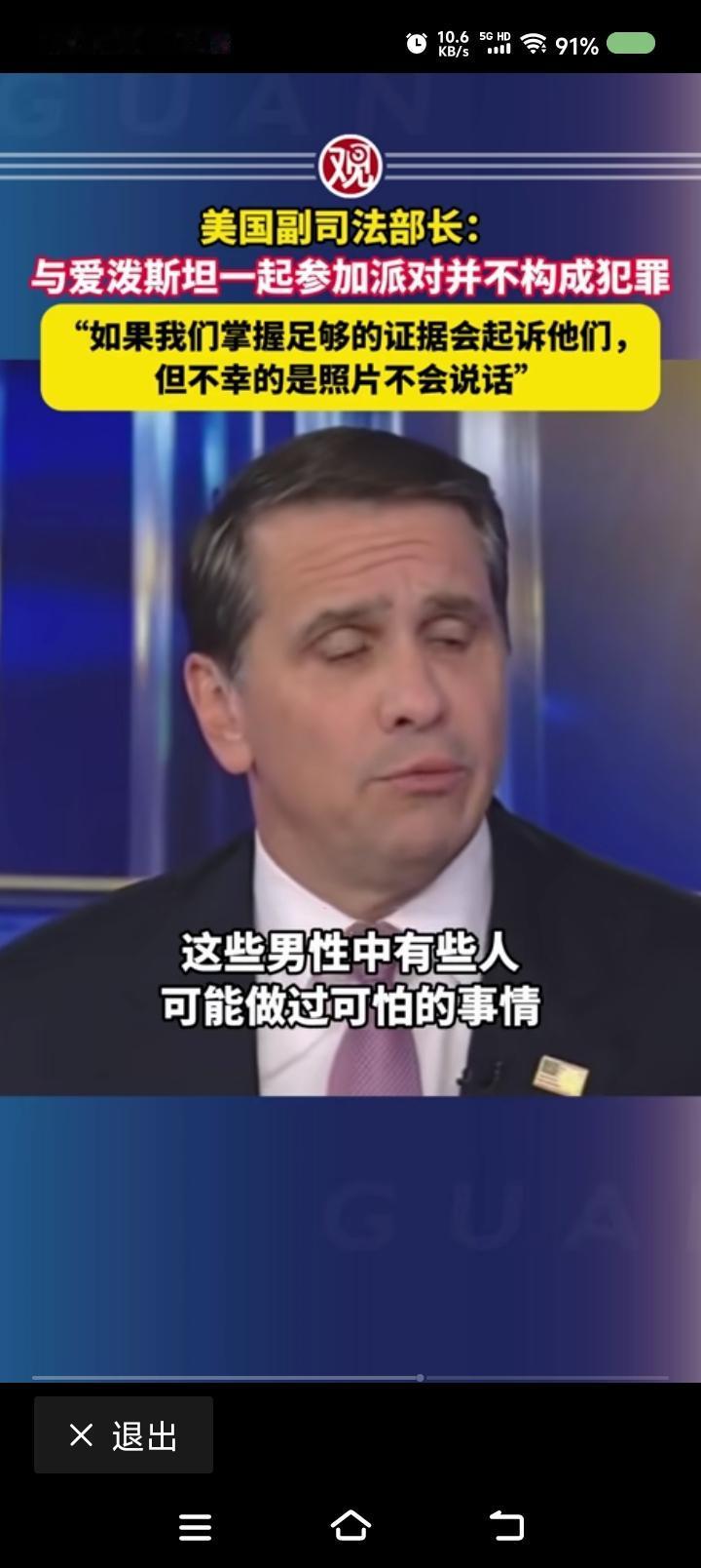 这就是美国司法部官员的水平?—— 据报道,主持人问美国司法部副部长:“爱泼斯坦案的文件公布了不少,有些人与爱泼斯坦聚会,与未成年人发生性行为,是否有人会被起诉?” 该官员说:“我们永远不会说‘不’。我们会对任何不当行为的证据调查。与爱泼斯坦聚会不违法,与他发邮件不违法……不幸的是,照片不会说话。” 点评: 是没有证据,还是不敢找证据?连特朗普都说这事过去了,别老盯着不放,司法部能有何作为? 有人以为特朗普会揭开爱泼斯坦案的真相,不料,倒垃圾式地公开一些信息,有的抹去,有的为了误导故意遮掩…… 丢人! 特朗普,你的第二任期,又是0分?