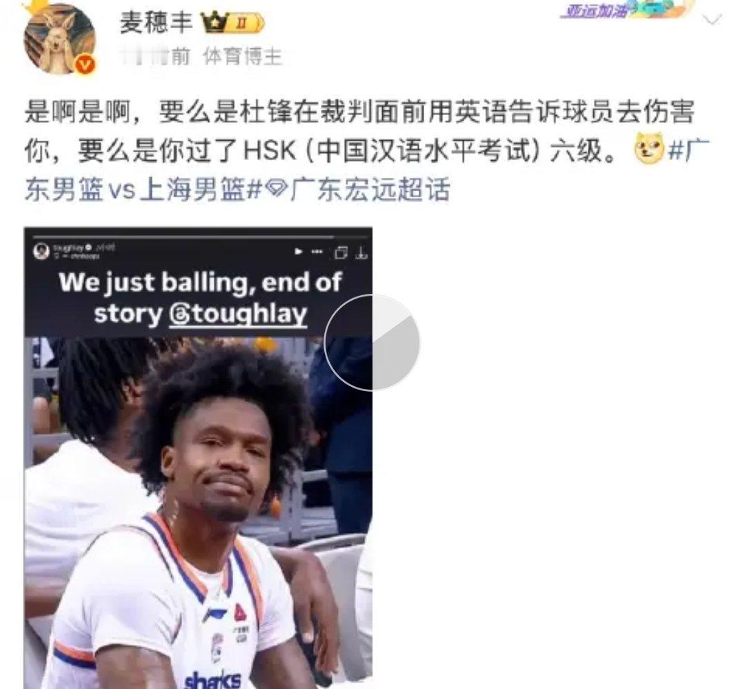 你可以说古德温迪亚洛中文不好,但广东男篮主教练杜峰英语那是应该挺好,不然迪亚洛不能捂耳朵!也请杜峰御用嘴替麦子别洗白了,你说的全国球迷也不是不懂。你用的理论回复你一下难道球迷能听懂几句英语,就非得考英语6级吗?我说对不?cba全网热点共创计划古德温社交媒体控诉杜峰CBA