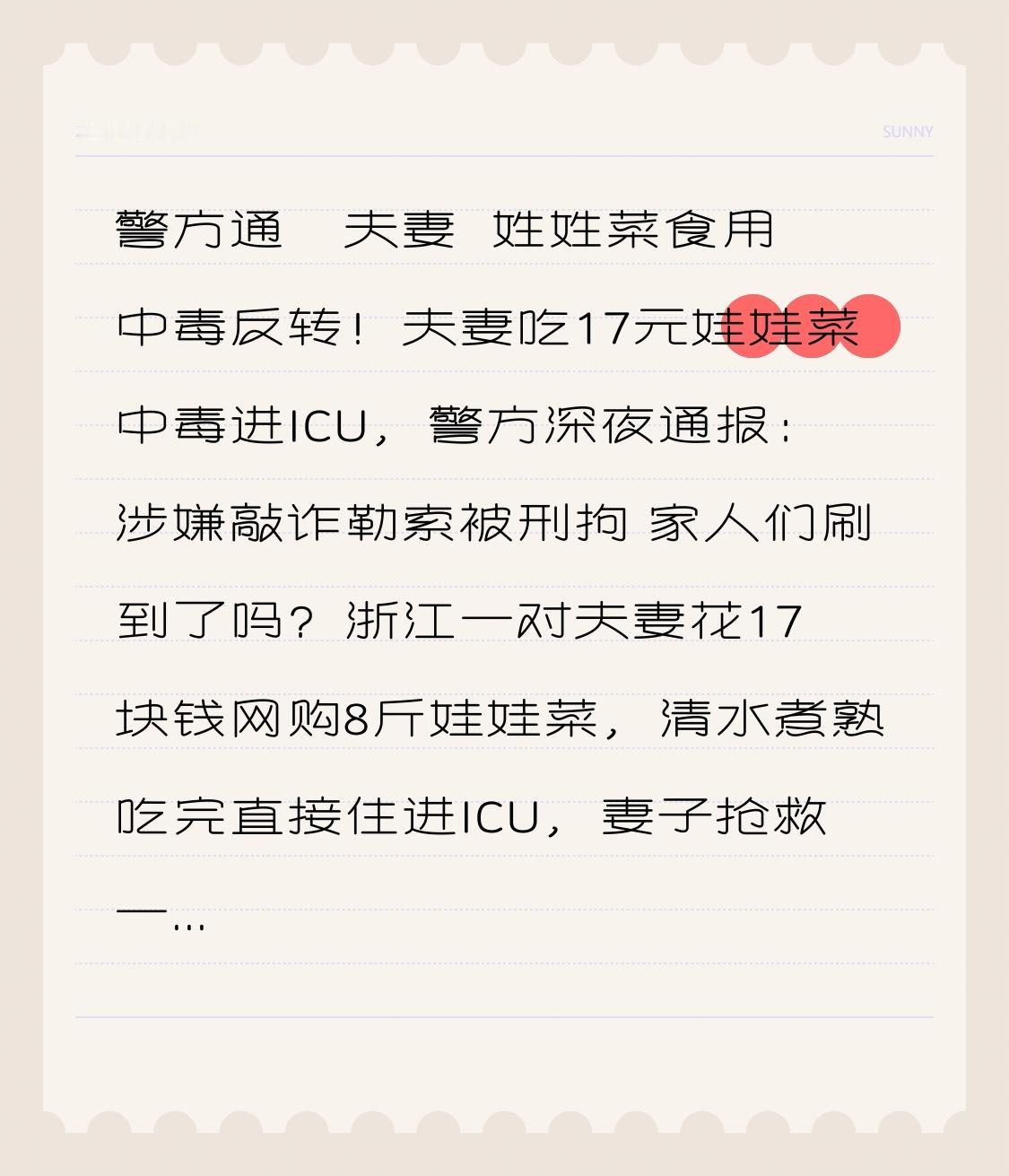 警方通扱夫妻 姓姓菜食用中毒 反转!夫妻吃17元娃娃菜中毒进ICU,警方深夜通报:涉嫌敲诈勒索被刑拘 家人们刷到了吗?浙江一对夫妻花17块钱网购8斤娃娃菜,清水煮熟吃完直接住进ICU,妻子抢救一个多月才脱险,丈夫全身出血、肺积水差点没挺过来!本以为是食品安全大问题,全网都在骂商家黑心,结果警方2月3日深夜通报一出,所有人都惊掉了下巴——这对夫妻居然涉嫌敲诈勒索,已经被依法采取刑事强制措施! 事情还要从去年12月说起,台州的杨女士和丈夫网购了一箱娃娃菜,当天晚上就煮来吃了。第二天两人就开始不对劲,杨女士流鼻血止不住,丈夫更是出现呼吸衰竭的症状,送到医院确诊是杀鼠剂中毒,凝血功能严重障碍。夫妻俩一口咬定是娃娃菜有问题,还晒出了医院诊断书和与商家的沟通记录,商家否认后直接注销了店铺,这波操作让网友更愤怒了,纷纷呼吁严查不良商家。 就在大家都为这对夫妻抱不平,甚至开始担心自己网购蔬菜安全的时候,剧情突然来了个180度大反转。警方经过一个多月的溯源调查、现场勘查和检验鉴定,发现事情根本不是夫妻俩说的那样。有权威渠道透露,侦查中发现下毒者其实是丈夫本人,所谓的“娃娃菜中毒”不过是精心策划的骗局,目的就是敲诈勒索商家。 这一下全网炸了锅!之前有多同情,现在就有多震惊。要知道,真正的食品安全事件确实让人揪心,比如广东就发生过一家6口误把断肠草当五指毛桃煲汤,3人进ICU抢救的真实案例。但这对夫妻却拿“中毒”当筹码,不仅误导了全网网友,还让真正需要维权的消费者今后维权更难,简直太过分了。 更让人无语的是,夫妻俩声称家里没有老鼠药,毒源只有网购的娃娃菜,可警方的调查结果直接打了脸。现在案件还在进一步侦办中,虽然具体细节还没公布,但被采取刑事强制措施意味着证据已经比较充分,等待他们的将是法律的制裁。 这件事也给我们提了两个醒:一方面,食品安全确实是底线,不管是网购还是线下买食材,都要选正规渠道,遇到问题保留好证据合理维权,像香椿含亚硝酸盐、蕨菜有致癌物这些常识也要记牢;另一方面,做人可不能没良心,现在网络传播快,一句谎言可能引发全网声讨,既伤害了他人,也葬送了自己。 想想那些真正因为误食有毒野菜、变质食品中毒的人,他们的痛苦是真实的,维权之路也不容易。而这种编造谎言、利用公众同情心敲诈勒索的行为,不仅触碰了法律红线,更凉了大家的心。食品安全需要我们共同守护,但诚信做人更是底线中的底线。 你怎么看待这起反转事件?平时网购食材会注意哪些问题?评论区聊聊你的看法,关注我,带你了解更多真实热点事件背后的真相!