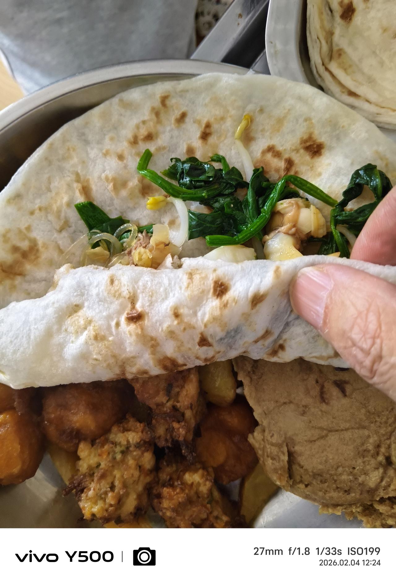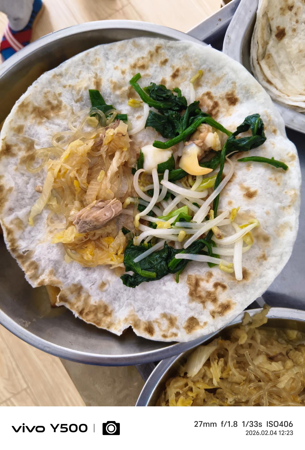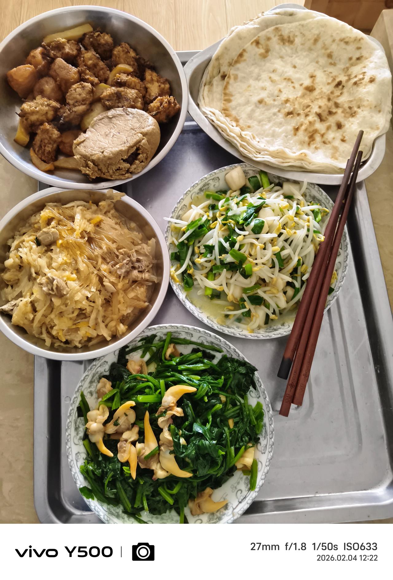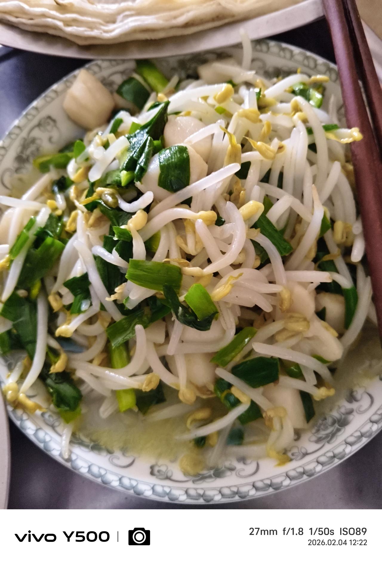 立春大于年,想一想万物复苏、小溪欢快、春暖花开都开心。 不说别的,尊重民俗,咬春吃春饼,庆祝24节气的第一节,祝愿这一年风和日丽百畜兴旺粮食满仓。 卷饼卷什么菜呢?在北方流传下来的就是绿豆芽炒韭菜、酸菜粉条五花肉、拌菠菜、条件好的其他的你就自己发挥吧! 今天中午正好休息,天气不冷,雾气腾腾,风都和昨天不一样。 韭菜豆芽扇贝丁炒起来,韭菜的微辣生发、豆芽的清爽脆甜、扇贝丁的鲜嫩富贵,色香味俱全呐,薄薄的白面饼一摊上述各菜少许卷起来,春天的味道通过味蕾激活你身体沉睡一个冬天的昂扬之气。 听一首春之歌圆舞曲,在乐曲声中拉开2026春天的大幕。