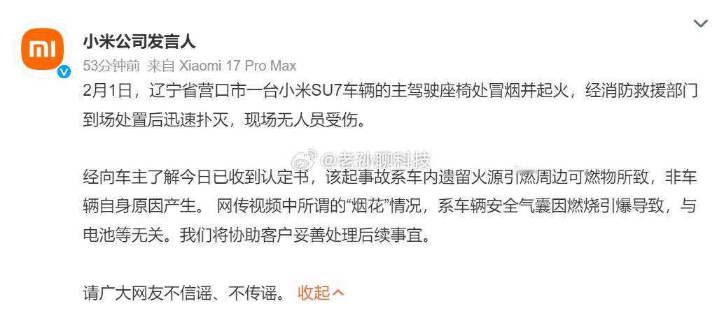 小米通报辽宁营口起火事件小米官方出来辟谣营口SU7起火的事了,2月1日那起事故,消防到场很快就扑灭了,万幸没人受伤