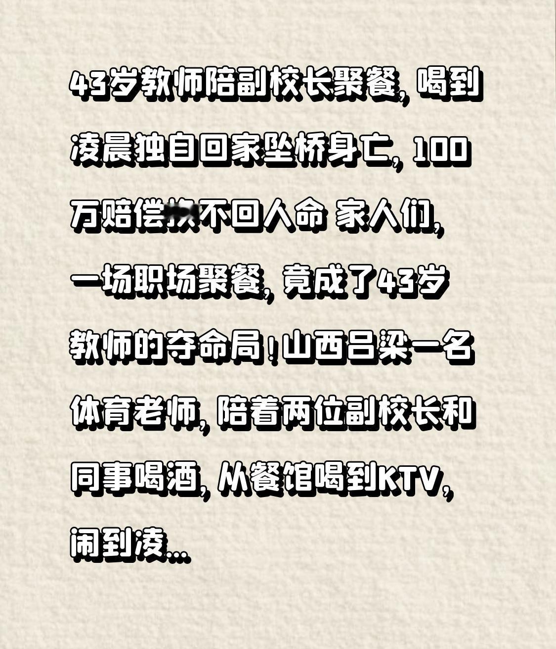 43岁教师陪副校长聚餐,喝到凌晨独自回家坠桥身亡,100万赔偿换不回人命 家人们,一场职场聚餐,竟成了43岁教师的夺命局!山西吕梁一名体育老师,陪着两位副校长和同事喝酒,从餐馆喝到KTV,闹到凌晨才散场,结果独自回家时坠桥身亡。100万和解费、多名领导被免职,这场悲剧到底是谁的错?背后的真相比你想象的更扎心。 事情发生在2026年1月8号,山西中阳县北街小学的任老师,本来是学校的骨干体育老师,平时带着学生训练,工作踏实又负责。可谁也没想到,一场看似普通的同事聚餐,会让他再也没能回家。当天下午,学校一名副校长牵头,约了包括任老师在内的4名男老师聚餐,吃到中途,另一位副校长也特意赶了过来,酒局从餐馆一直延续到KTV,推杯换盏间,不知不觉就到了1月9号凌晨。 散场后,醉醺醺的几人各自散去,任老师发现手机落在了KTV,转身折返寻找时,因为酒精上头,意识模糊、脚步虚浮,竟走错了路,失足从340省道的覃沟桥上摔了下去。直到第二天清晨,焦急万分的妻子才在桥下找到昏迷不醒的他,浑身是伤、一动不动。尽管医生全力抢救了一天一夜,可任老师还是因为颅脑损伤过重,在1月10号永远离开了人世,法医鉴定显示,他血液里的酒精浓度严重超标,属于醉酒状态。 这场悲剧的转折点,藏在后续的调查和处理中。一开始有人说,这只是朋友间的自愿聚餐,任老师作为成年人该对自己负责;但随着调查深入,更多细节浮出水面:这是副校长牵头组织的聚会,并非单纯私人交往,而且散场时明知任老师醉酒,却没有任何人主动护送,任由他独自夜行,这已经违反了共同饮酒的注意义务。最终,当地纪委和公安成立联合调查组,涉事的校长、两名副校长全部被免职,参与聚餐的3名老师被问责,教育局分管领导也受到了相应处分,涉事方还赔偿了家属100万元达成和解。 可再多的赔偿、再重的处分,也换不回一个鲜活的生命,换不回一个完整的家庭。任老师走后,留下了悲痛的妻子和未长大的孩子,他原本该在课堂上带着学生奔跑,该在春节和家人团聚,却因为一场无意义的酒局,永远定格在了43岁。更值得深思的是,这场聚餐到底是“慰劳员工”还是“职场应酬”?如果当时有人少劝一杯酒,如果有人主动送他回家,如果酒局没有从下午持续到凌晨,这场悲剧是不是就不会发生? 其实法律早有明确规定,共同饮酒人有劝阻、护送的义务,明知对方醉酒却放任其独自离开,就要承担相应责任。不管是职场聚餐还是朋友小聚,喝酒从来都不是目的,安全才该是底线。可现实中,多少人被“不喝就是不给面子”绑架,多少人把“喝到位才是感情深”当真,最终把好好的聚会变成了悲剧的导火索。 43岁教师的生命代价,给所有人敲响了警钟:职场不是酒桌,情谊不靠酒精,安全永远比面子重要。希望这样的悲剧不再重演,也希望每个参与聚餐的人都能守住底线,不劝酒、多关照,让每一次相聚都能平安归来。你怎么看待职场酒局的“潜规则”?如果是你,会拒绝这样的深夜酒局吗?评论区聊聊你的看法,点赞关注,一起传递安全底线,守护身边人的平安。