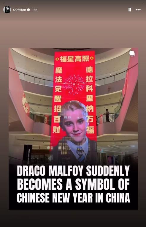 马尔福扮演者、现年38岁的英国演员汤姆·费尔顿当地时间3日也在社交媒体上回应这股热潮。CNN称,他在Instagram上转发了一则图片动态,图片中是中国商场内悬挂的一幅巨大马尔福春节海报,下方字幕写着“德拉科·马尔福突然成了中国新年的象征”。