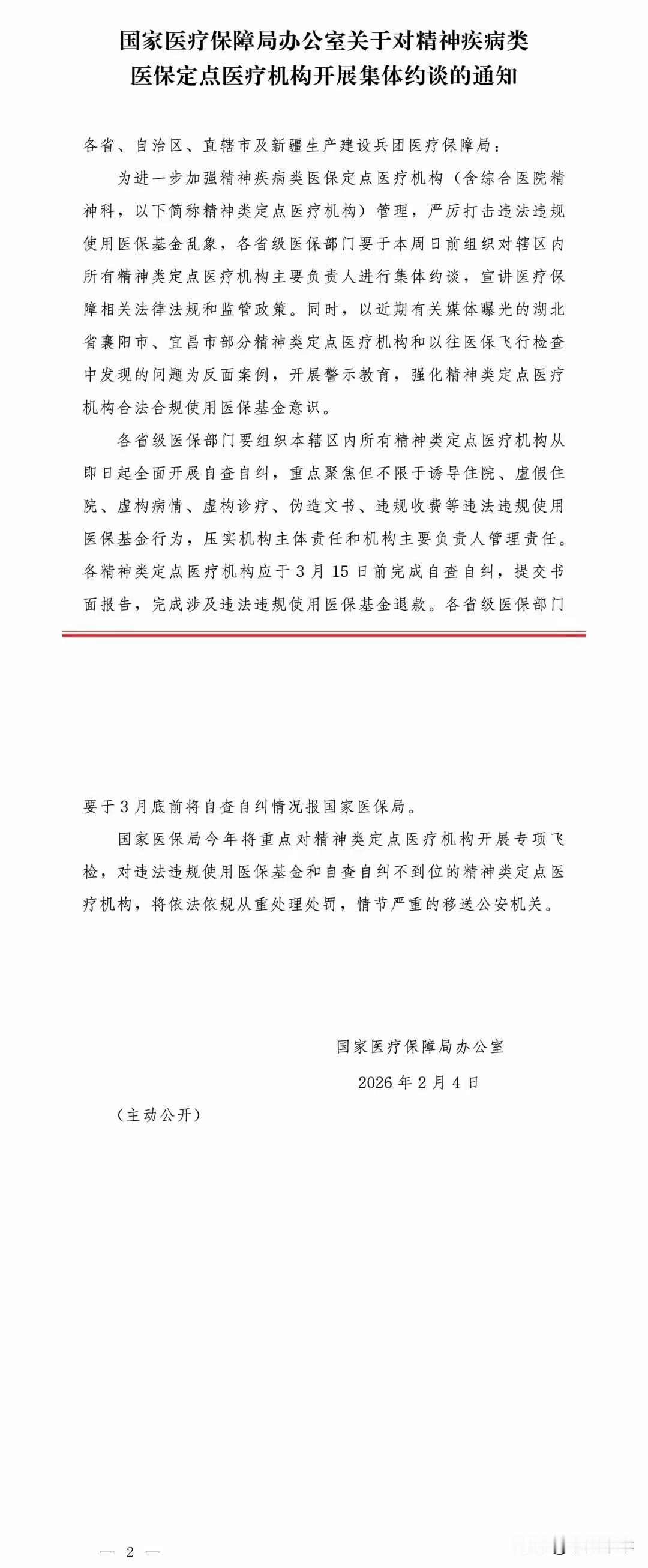 国家终于出手!精神病院骗保黑幕,这次要连根拔了!人民日报刚曝光湖北精神病院的“免费囚笼”,国家医保局就直接掀了桌子! 今天,医保局紧急下发通知,要求全国所有精神病类定点医院的负责人本周内必须集体约谈喝茶,用襄阳、宜昌的黑医院当反面教材现场警示教育。这意思再明确不过:别以为躲在黑箱里没人管,全国的账现在要一起算! 不仅如此,所有医院必须立刻自查自纠,3月15日前把骗的医保钱吐出来,还要书面报告。今年医保局还会搞专项飞行检查,查到违法违规的直接从重处罚,情节严重的直接送公安局! 这波操作,就是冲着之前的四大漏洞来的: ✅ 医保审核不再是摆设:飞检就是要盯着每一笔救命钱的去向; ✅ 行业监管不再是纸老虎:集体约谈+自查自纠就是敲山震虎; ✅ 患者权益终于有了靠山:国家出手就是给黑医院套上紧箍咒; ✅ 黑箱操作即将被打破:全国性整顿就是要让阳光照进精神病院。 人民日报说“发现一起查处一起”,现在国家直接升级成“全国排查、从重打击”。这不仅是给受害者一个交代,更是给所有医疗机构划下红线:医保基金是救命钱,谁动谁坐牢;患者权益是底线,谁碰谁完蛋! 希望这次不是一阵风,而是真的刮骨疗毒,让那些披着白大褂的恶魔付出代价,让真正需要帮助的人能安心治病。
