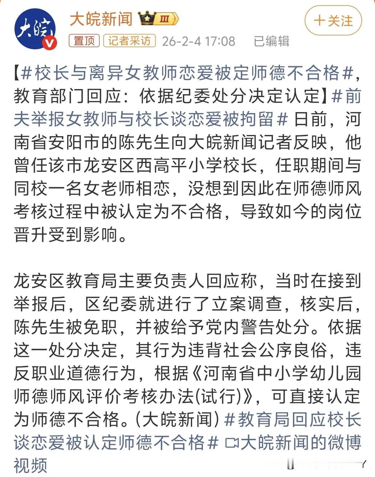 校长与离异女教师恋爱被定师德不合格!河南安阳一位小学原校长和同校的离异女教师,因为两人的恋爱关系,被教育部门认定为师德不合格,引发了大家的关注。 河南安阳一小学原校长陈某和同校离异女教师韩某谈恋爱,结果被教育部门评定为师德不合格。这事说起来,桩桩件件都透着让人琢磨不透的地方。 陈某离婚多年,韩某也是离异状态。2023年,两人悄悄走到了一起,感情的事没对外声张。谁也没想到,韩某的前夫不知从哪弄到了两人的聊天记录,打印成传单往教育局送,一下子把这事闹得人尽皆知。 网络上议论纷纷,风言风语里,这事渐渐变了味。陈某气不过报了警,警方调查后,对散布传单的人做了处理,行政拘留加罚款,算是给了个说法。 本以为这事能慢慢平息,可2024年6月,当地纪委的调查结果出来了——认定陈某的行为违反社会公德和党的生活纪律,给了党内警告处分,校长职务也没了,调去了另一所小学。 更重的影响还在后面,教育局依据河南省中小学幼儿园师德师风评价考核办法,结合纪委的处分,直接给陈某2024年度的师德考核打了“不合格”。韩某更惨,被学校辞退了。 直到2025年底,学校搞岗位晋升竞聘,陈某调资料时才发现自己师德考核不合格,晋升的路被堵死了。他想不通,自己和韩某都是单身,正常谈恋爱,怎么就扯上师德了?“我没做错什么,”他不止一次这样说。 教育局那边有自己的理:处分当时就送达到本人,还在校内公示过,按政策办事没毛病。双方各执一词,网上的讨论也没停过。有人觉得,恋爱是私事,只要不违反法律,学校和部门不该管这么宽。 也有人说,校长和本校教师谈恋爱,难免影响工作,算师德问题也说得过去。老话说“清官难断家务事”,可这事不只是家务事,还牵扯到职场关系。学校是教书育人的地方,老师的言行确实会被格外关注。 但“师德”的边界在哪?正常的婚恋自由,该不该被纳入考核范围?陈某和韩某都是离异后交往,既没破坏别人家庭,也没在工作中徇私舞弊。聊天记录被前夫曝光,本身已经是受害者,最后却落得一个丢了职务、一个丢了工作的下场,换谁心里能平衡? 再说师德考核,核心本应是教师的职业道德、教学行为、对学生的引导。如果把正常恋爱也算作“不合格”,那是不是有点本末倒置?网友们争论的,其实就是这个理:公权力该不该干涉私人生活?职场规则和个人情感,该怎么划清界限? 韩某的前夫散布隐私,已经受到了法律制裁,说明这种行为本身不被认可。可后续对陈某和韩某的处理,却像是在为这种“报复”背书。这会不会让更多人觉得,只要把私事闹大,就能毁掉别人的工作和前途? 从2023年恋爱到2025年影响晋升,两年多的时间里,这件事像块石头压在两人身上。陈某想不通,公众也在琢磨:到底是规则太严,还是执行时走了样? 师德是教师的立身之本,没错。但评判师德,总得有个清晰的标准,不能把私人领域的正常交往随意扣上“失德”的帽子。如果连单身男女谈恋爱都要被上纲上线,那职场里的人情味,怕是要越来越淡了。 这事还没结束,后续怎么发展不好说。但它抛出的问题值得所有人思考:规则的尺度该如何把握?私人生活和职业操守之间,该怎么找到平衡点?或许等这些问题有了答案,类似的争议才会越来越少。 消息来源:大皖新闻
