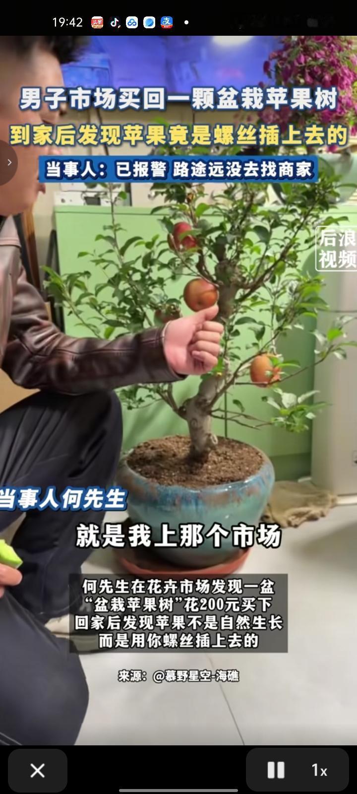 2月2日,天津。何先生在花卉市场发现一盆“盆栽苹果树”,花200元买下,回家后发现苹果不是自然生长,而是用螺丝插上去的。何先生被卖花大家忽悠,还买了别的花,一共消费285元,随后报警处理。民警建议回去找商家,但因路途遥远成本太高,最终选择认栽。