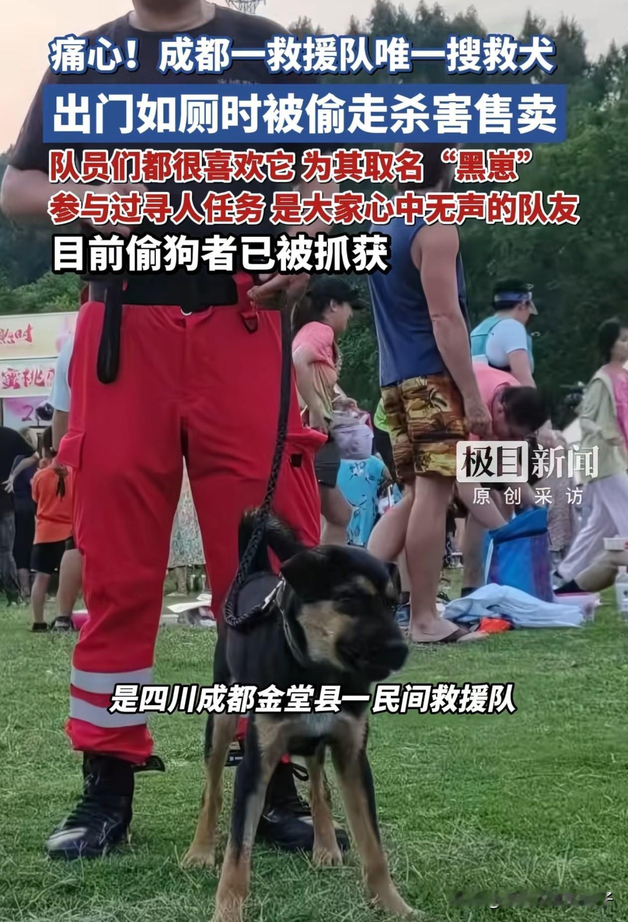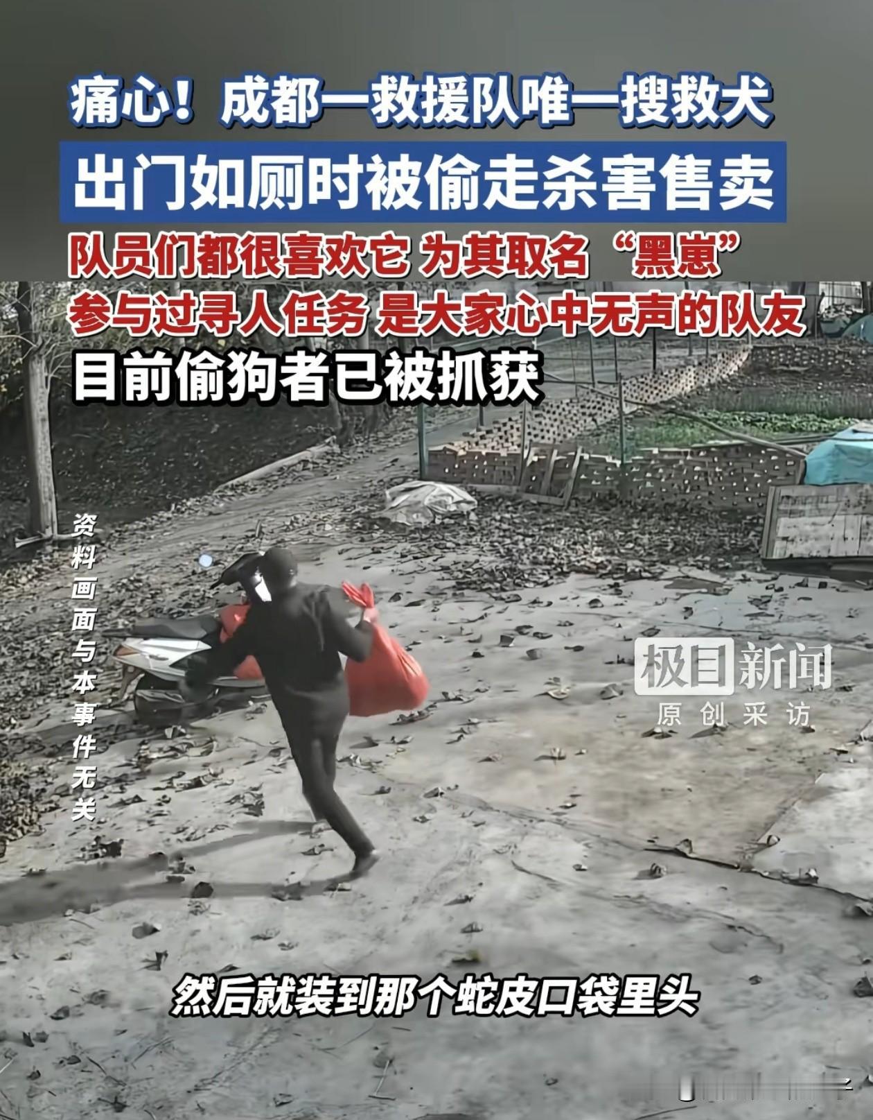 真的是又蠢又坏!四川,男子以为救援队基地人少好下手,就趁队员外出执行任务时,悄悄蹲守在基地外面,用迷药将出来上厕所的搜救犬迷晕偷走。 可惜这一幕被监控拍得清清楚楚,很快警察就根据视频锁定了偷狗者,在2月4日将其抓获,可那只名叫“黑崽”的搜救犬,已经被偷狗者残忍击打致死,连夜卖给了狗贩子。 这只11个月大的黑崽,是成都金堂这支民间救援队的唯一搜救犬,黑崽原本是一只流浪狗,队员们收养它后,众筹了1万多元,把它送到专业机构训练数月,才刚上岗不久,给崽就参与了好几次救援任务。 黑崽出事之后,队员们又气又心痛,不是心痛花的钱打了水漂,而是他们早就把黑崽当做并肩战斗过的伙伴,没想到就这样被偷狗者卖了。 搜救犬虽然不是保护动物,但它作为具备特殊社会价值的工作犬,培育成本高、救援意义重大。 这种为了一点蝇头小利,就残害“无言英雄”的人,真的是又蠢又坏,必须严惩!