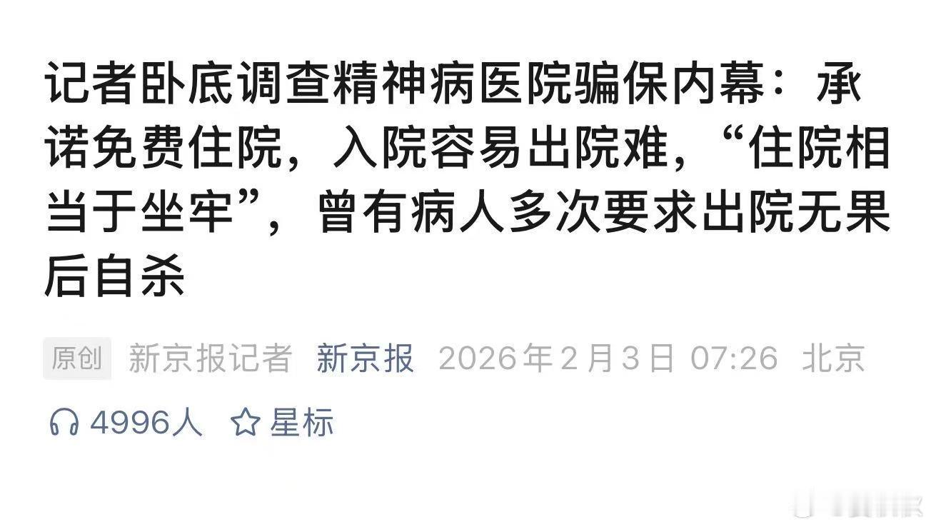 你看了《新京报》吗?你看到湖北襄阳精神病医院的卧底调查了吗?必须要说,这黑暗度,超过了我最大的忍耐。这么多精神病医院,承诺“免费住院、免费接送”,争相抢夺病患资源,甚至组织人员下乡招揽患者。为了什么?为了骗保。所以呢,正常人也能入院,护工、保安,也办理了住院手续,成为所谓的“精神病人”。“一个月一个人套5000,一年6万,100个病人就是600万,成本一年就赚回来了”。因为能赚钱,所以一些医院“舍不得”病人,便千方百计阻止病人出院,有些常年住院的病人直言“住院如同坐牢”,有些住到去世,甚至还发生过病人自杀事件。目前,相关部门已经发布通告,成立专班从严调查。此事其性质之恶劣,令人发指。医院是救死扶伤之地,如今却异化为蚕食公共利益的“黑洞”,这不仅是对法律的公然践踏,更是对人伦底线的冷酷挑战。那些被当作“摇钱树”的病人,尤其是丧失正常表达能力的老年群体,在他们最需要关怀和保护的地方,却遭受着制度性的欺骗与虐待,这何尝不是一种双重伤害?事件背后更深层的,是监管的长期“失明”与“休眠”。如果不是勇敢的记者冒险卧底,这些暗箱操作恐怕至今仍畅行无阻。封闭环境不能成为监管缺位的借口,反而应成为加强监督的理由。相关职能部门必须反思,为什么日常的巡查、审计、医保审核等防线层层失守,直至问题被媒体置于聚光灯下才匆忙行动?这种事后补救的被动姿态,本身就是一种不作为。所以呢,不要就事论事,当前的调查绝不能止于个案处理,必须掀起一场行业整顿的风暴。要依法严惩责任人,让违法者付出沉重代价。仔细想一想,被送进精神病医院的正常人,该是何等的绝望,何等的黑暗啊。