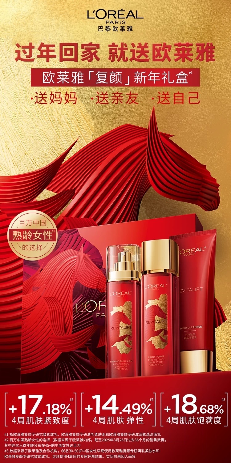 晚会的开场“暴击”,是一道关于“回家”的命题作文。锤娜丽莎和李川的小品《美美回家》,堪称“当代青年春节求生实录”。从“24K塑料大金链”到“AI气泡音水杯”,每一件精心准备的“翻车礼物”,都让屏幕前的观众脚趾抠地、会心一笑。直到欧莱雅复颜新年礼盒的出现——抗皱紧致、实用体面——瞬间解救了所有社交尴尬。它精准地戳中了当代年轻人的送礼痛点:最好的礼物,从来都是一份“我懂你”的体贴~