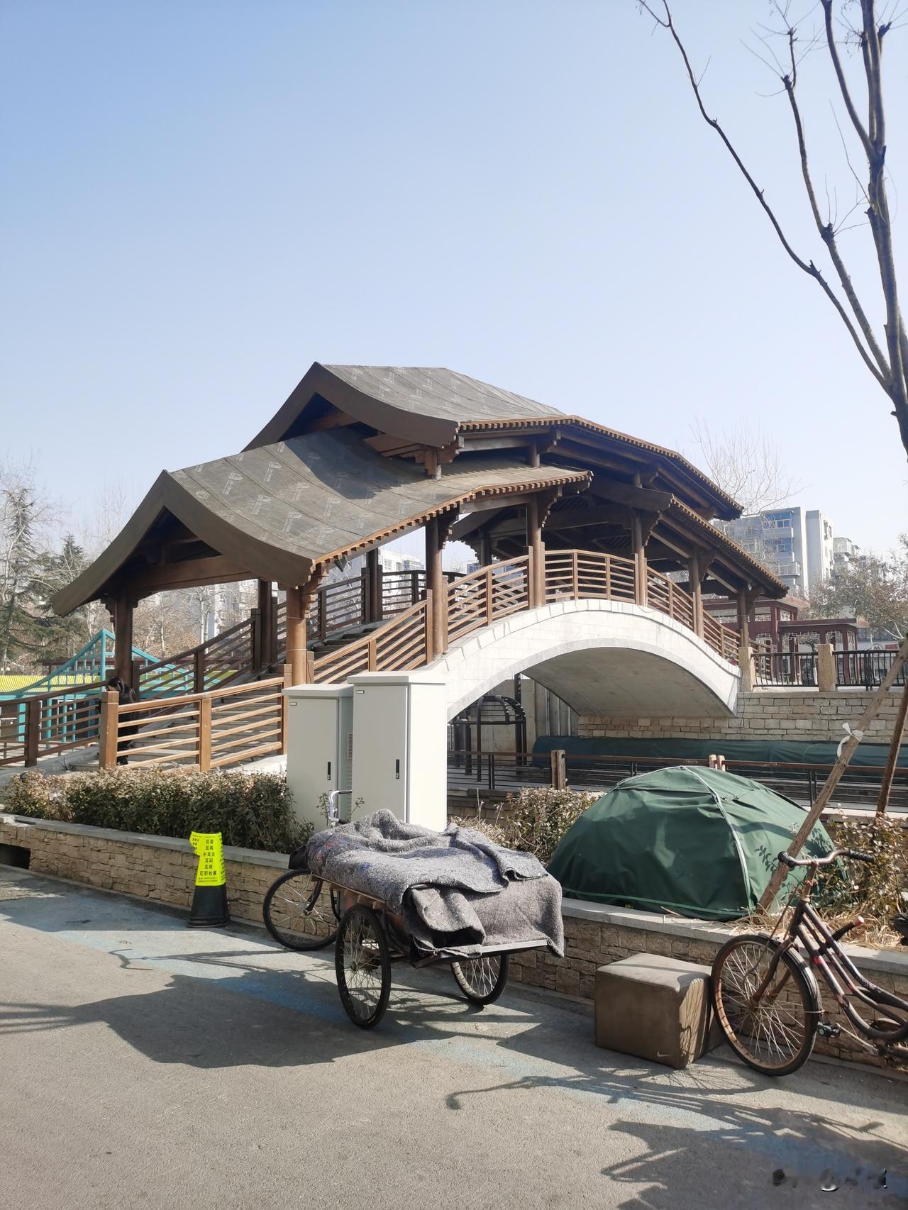 上午路过花椒园街,远远的就看到了新建在护城河上的廊桥。乍一看还挺像那么回事,仔细一瞅顶子上还裸露着防水涂层。没记错的话这座廊桥在国庆节的时候就建到这个程度了吧,这算是完工了呢?还是等明年再继续建。