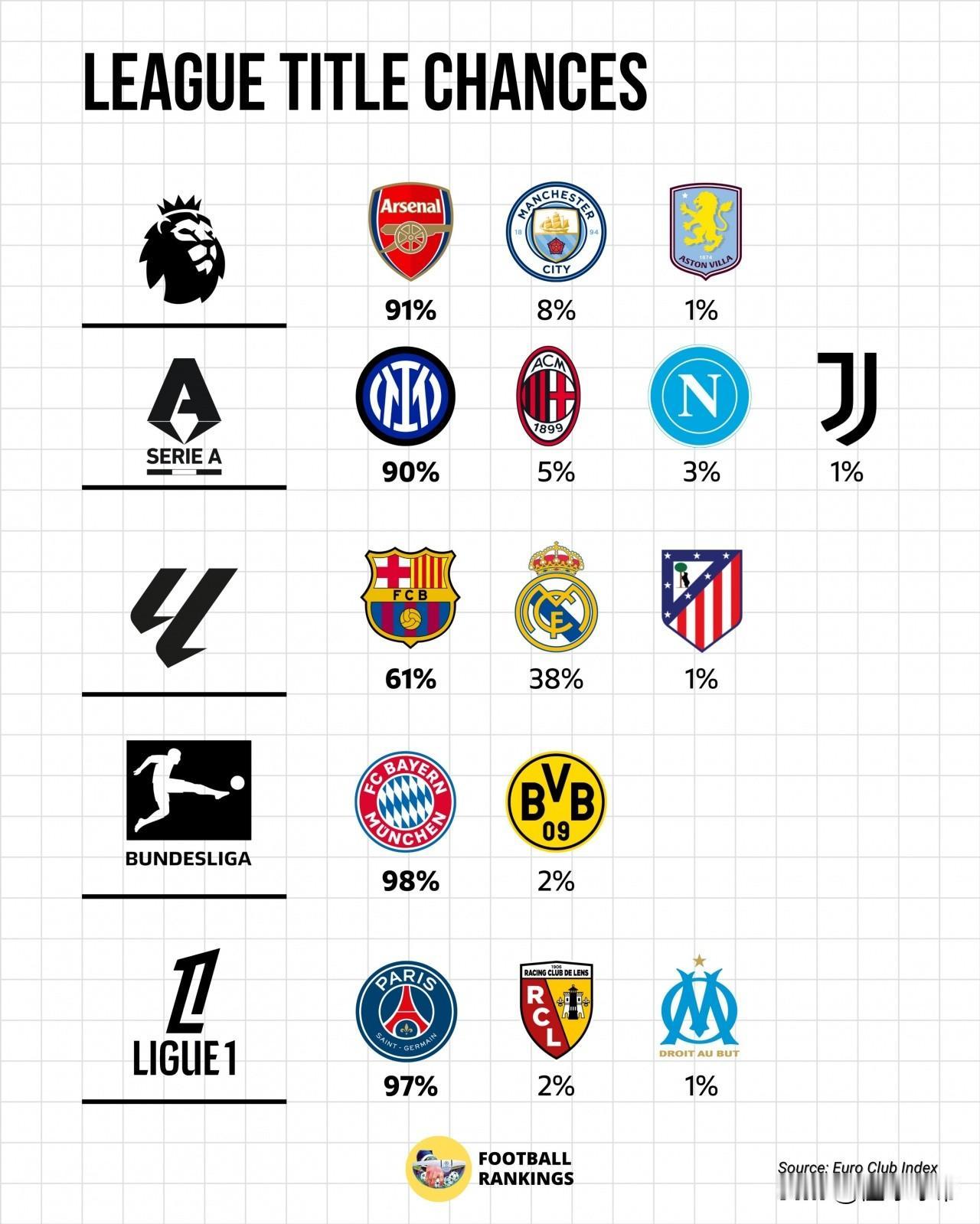 五大联赛冠军基本没悬念了,领头羊夺冠概率都超过了60%! 英超——阿森纳6分领跑,夺冠概率高达91%; 意甲——国米5分领跑,夺冠概率高达90%; 西甲——巴萨1分领跑,夺冠概率高达61%; 法甲——大巴黎2分领跑,夺冠概率高达97%。 五大联赛也就西甲可能稍微有点悬念,不过以目前巴萨和皇马的状态,巴萨是不会给皇马一点反超的机会了,反倒是阿森纳掉链子的可能比巴萨更高了。
