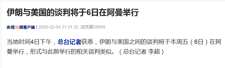 【#伊美谈判将于6日在阿曼举行#】当地时间4日下午,总台记者获悉,伊朗与美国之间的谈判将于本周五(6日)在阿曼举行,形式与此前举行的相关谈判类似。