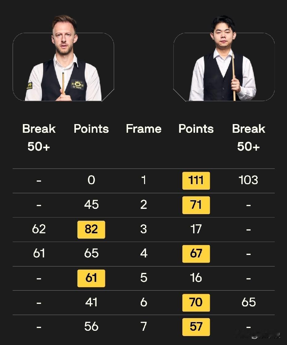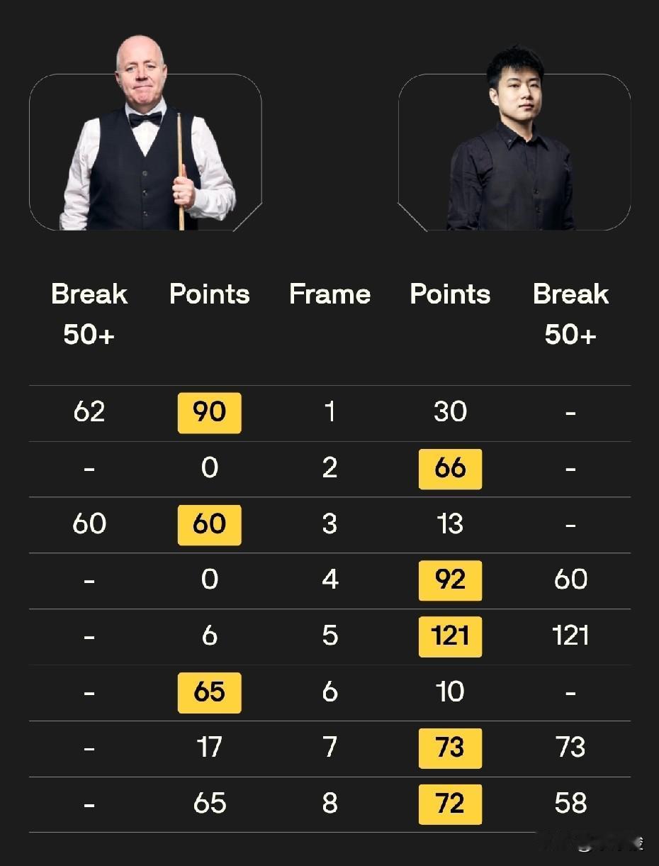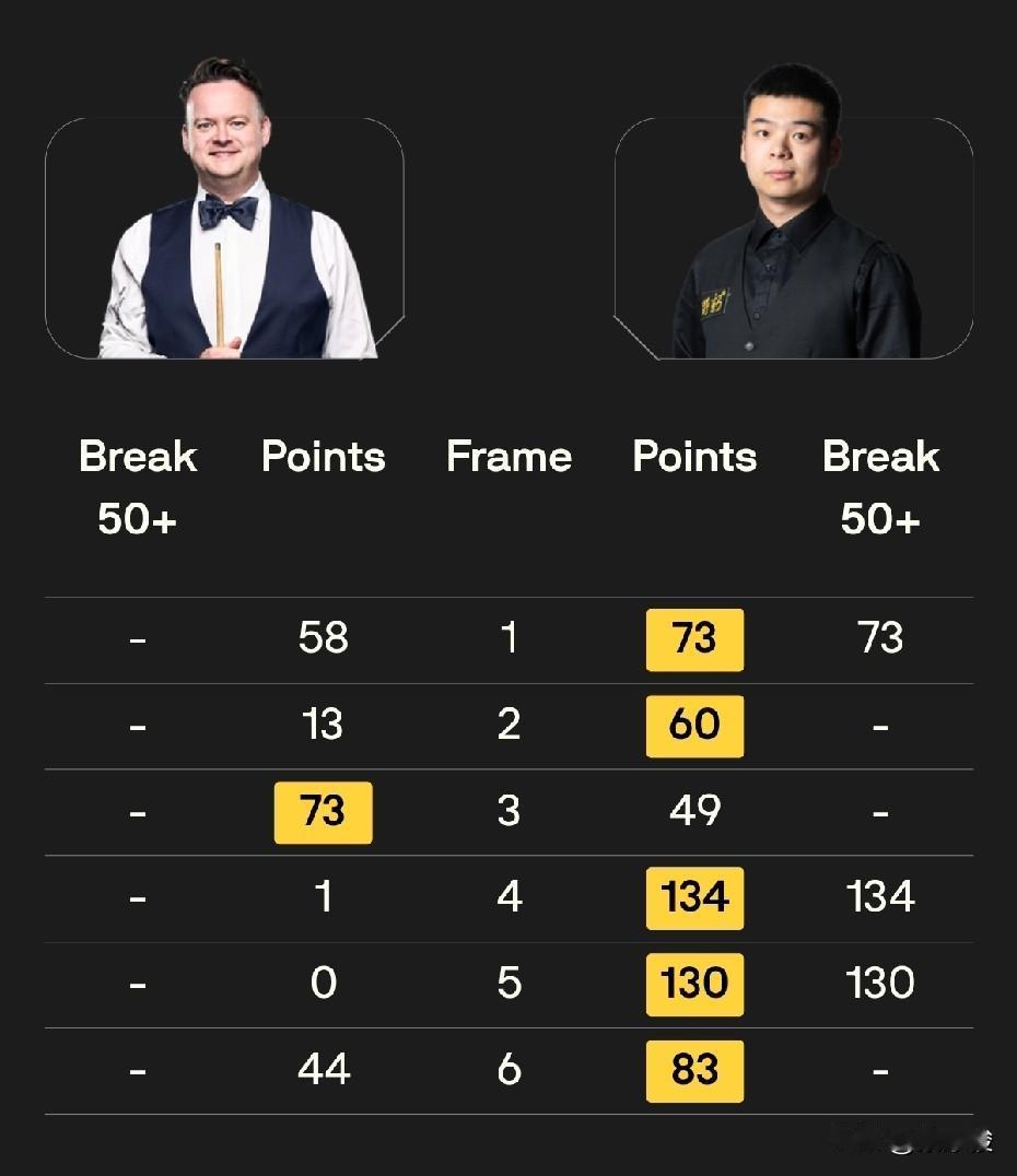 世界大奖赛第一轮结束,9名中国球员晋级;今天晚上3名中国球员全部获胜。庞俊旭5-1大胜墨菲,赵心童5-3胜希金斯,袁思俊5-2胜特鲁姆普,袁思俊两局逆转,改写之前从没胜过特鲁姆普的纪录。 似乎是受到之前中国球员良好表现的鼓舞,今天晚上7点开始的3场中国球员的硬仗,球员全面发力,3场全胜。 率先结束的一场比赛,庞俊旭5-1大胜墨菲,强势晋级第二轮。这场比赛墨菲状态低迷,前4局1-3落后,其中第4局,庞俊旭打出单杆破百。局间休息后,庞俊旭连下两局,其中第5局再来一杆破百。 赵心童与希金斯的比赛,前4局双方2-2战平。第5局,赵心童单杆破百,3-2领先。之后双方各胜一局,比分来到4-3,赵心童拿到赛点。其中第7局,赵心童拿到73分,即将超分,结果一杆简单黑球不进,差点被希金斯逆转。 第8局,赵心童58-8领先,又出现简单红球不进,希金斯追到38-58转入防守,之后赵心童打进最后一颗红球做了一杆斯诺克,希金斯解球失误,赵心童65-38延分,希金斯再解球漏球,可惜赵心童没打进黄球。最终希金斯清台,65-65,争黑决胜。争黑,赵心童打进黑球,比赛戛然而止,赵心童5-3战胜希金斯,晋级第二轮。 特鲁姆普与袁思俊的比赛,袁思俊3-1领先,其中第4局,袁思俊67-65逆转。之后双方各胜一局,袁思俊4-2拿到赛点。第7局,袁思俊57-56一分再次逆转,总比分5-2拿下世界第一特鲁姆普。此前袁思俊从来没有赢过特鲁姆普,这回终于翻身。 晚上进行的唯一一场外战,艾伦与卡特战至决胜局。决胜局卡特5-4获胜。 至此,世界大奖赛第一轮经过两天的激战,中国10名球员参赛,9人晋级,唯一被淘汰的是丁俊晖。 明天世界大奖赛将进行第二轮的比赛,具体对阵如下: 13点: 肖国栋vs火箭奥沙利文 斯佳辉vs庞俊旭 张安达vs霍金斯 韦克林vs斯莱瑟 19点: 吴宜泽vs常冰玉 赵心童vs塞尔比 周跃龙vs杰克·琼斯 袁思俊vs卡特。 由于有两场中国德比,实际上已经有两名中国球员率先晋级8强。 中国球员,加油!