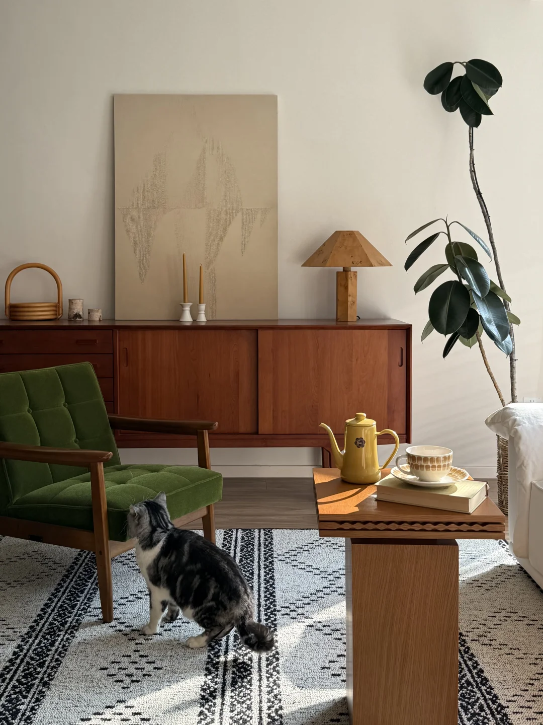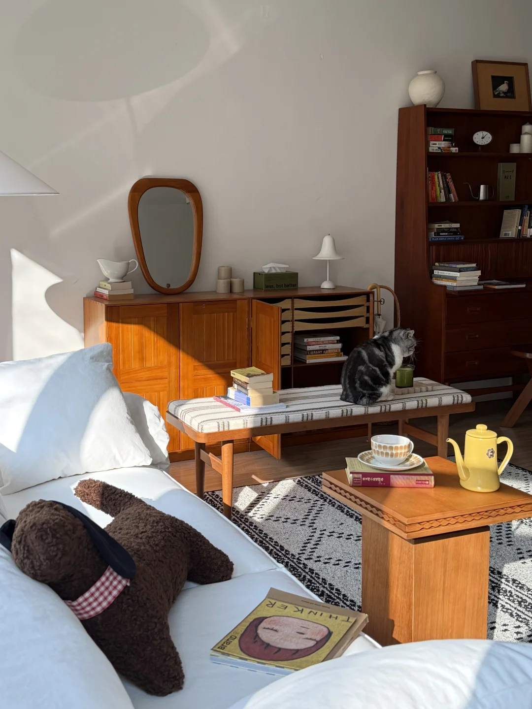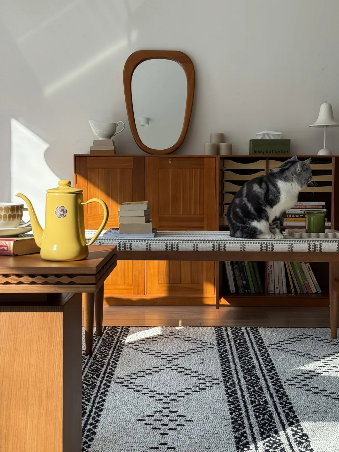 家的松弛感,一半来自柚木与羊毛。天然材质的拙朴感是让家更像适合人居住的家的关键。我乐此不疲的让家“野”起来。看着像中古家具的木质斗柜们、似乎是从非洲旅行带回来的羊毛地毯。