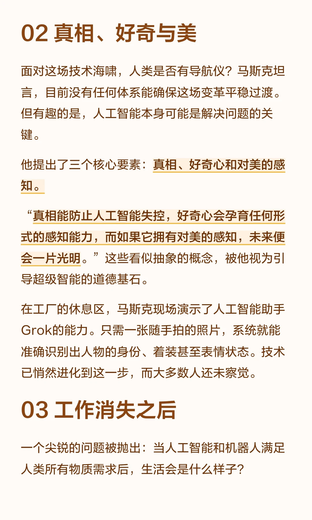 AI将重塑工作,人类需选择应对策略。他强调真相、好奇与美,认为AI能引导超级智能。