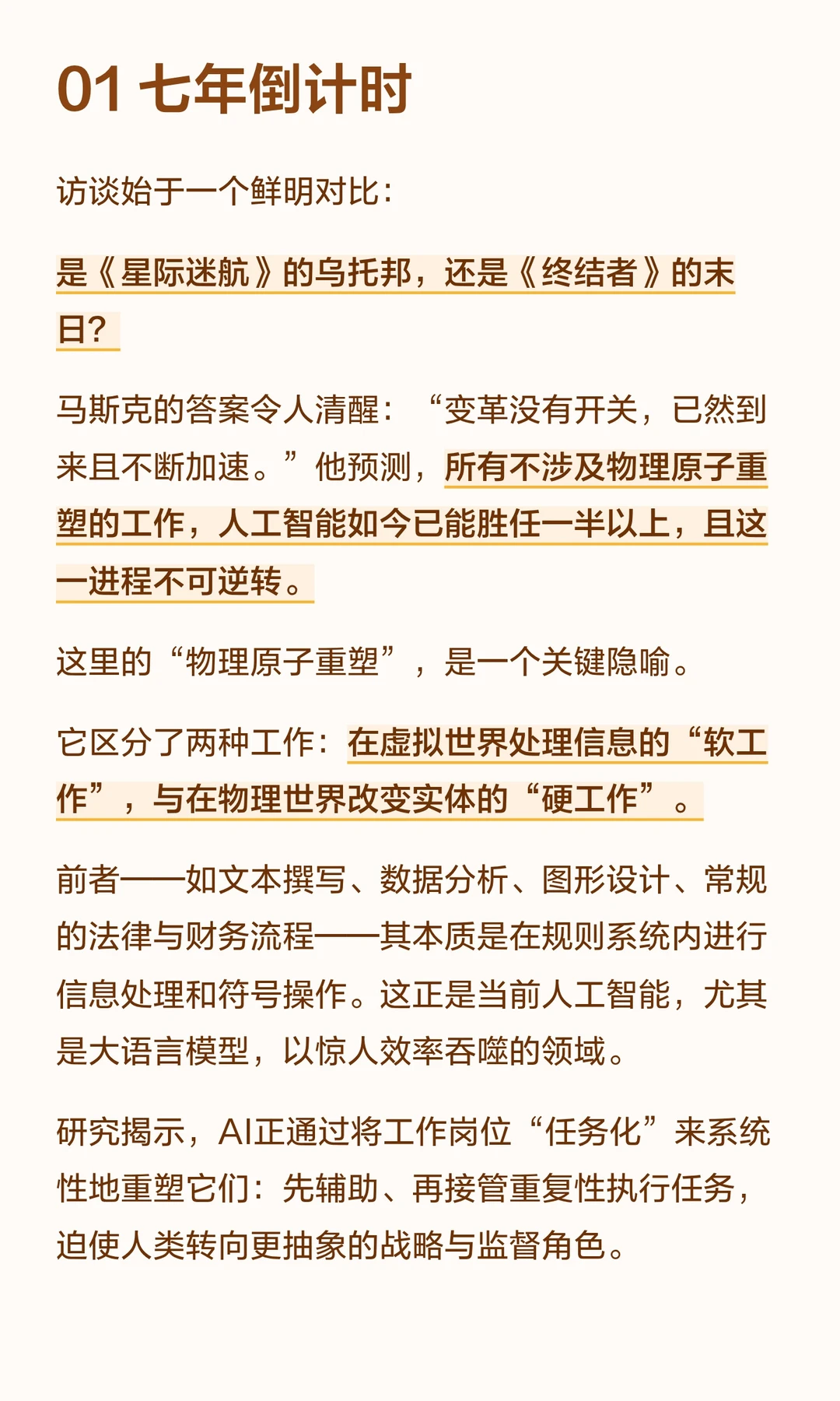 马斯克的答案令人清醒:“变革没有开关,已然到来且不断加速。”他预测,所有不涉及物理原子重塑的工作,人工智能如今已能胜任一半以上,且这一进程不可逆转。