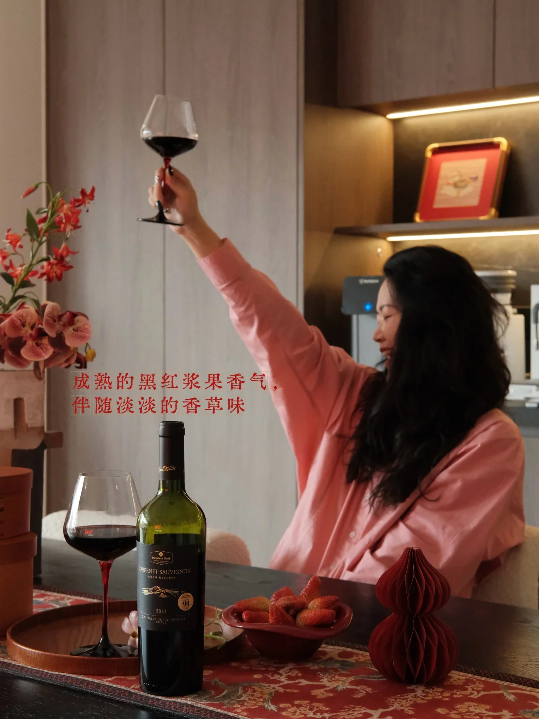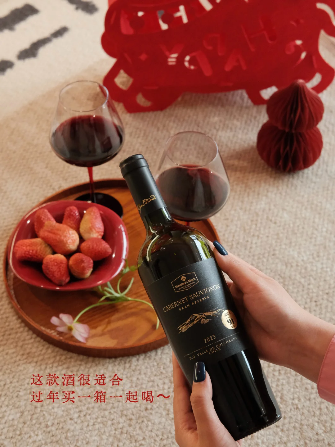 在山姆买的这支MM特藏赤霞珠,来自智利核心的精华产区Colchagua,深宝石红的酒液,恰好呼应了新春的主色调。除夕时,全家围坐,年夜饭的压轴戏便是开瓶的瞬间。“啵”一声轻响,馥郁的浆果香气温柔弥漫,伴随淡淡的香草味和烘焙的香气,像是一整年的故事都浓缩在了酒里,让人意犹未尽。