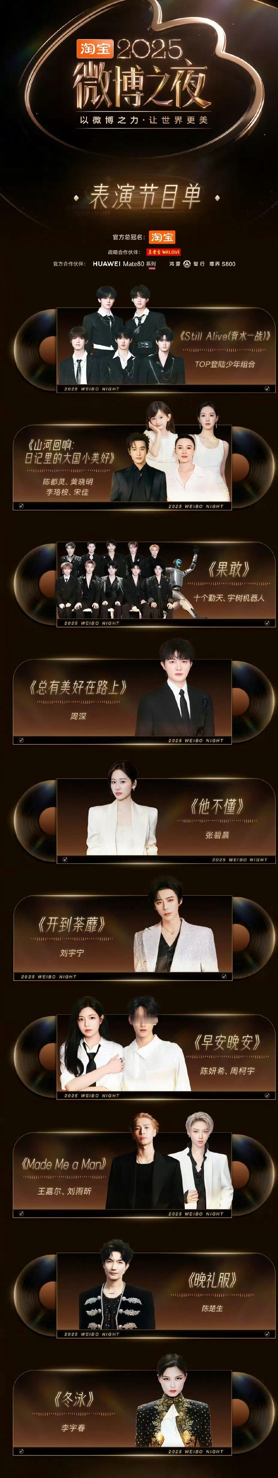 微博之夜节目单微博之夜节目单来了:Top登陆少年开场周深 张碧晨 刘宇宁独唱陈妍希 周柯宇合体王嘉尔 刘雨昕合唱陈楚生 李宇春收尾